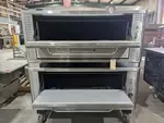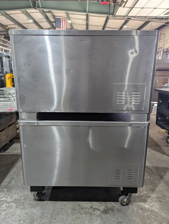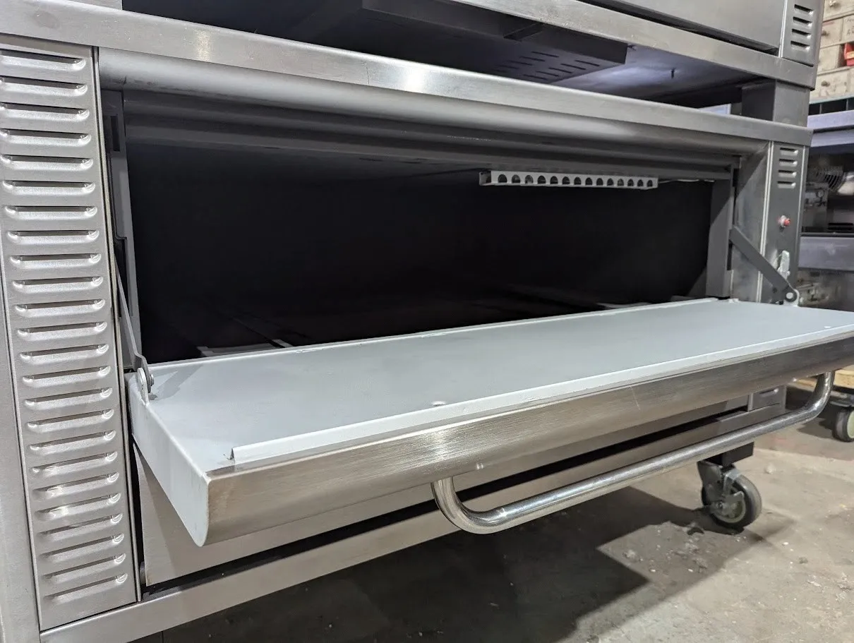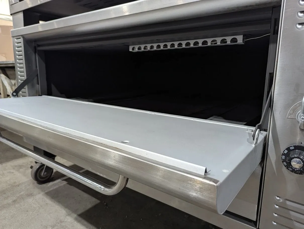 (USED) Natural gas, 48"W x 37"D deck interior, (2) 10" high sections, mechanical thermostat, QHT Rokite deck, spring assist door with concealed hinges, full angle iron frame, crown angle trim, stainless steel top, front and sides, 12" stainless steel legs, crown angle leg frame, flue connector, 85,000 BTU per section (170,000 BTU total), cETLus, NSF, CE, SN# 0914120AQ22B and 091412QA021T