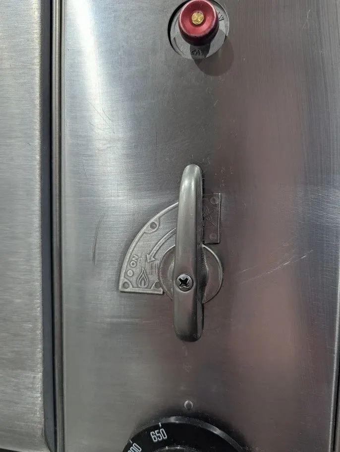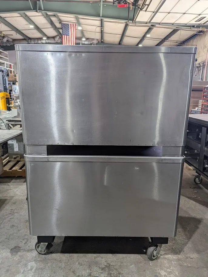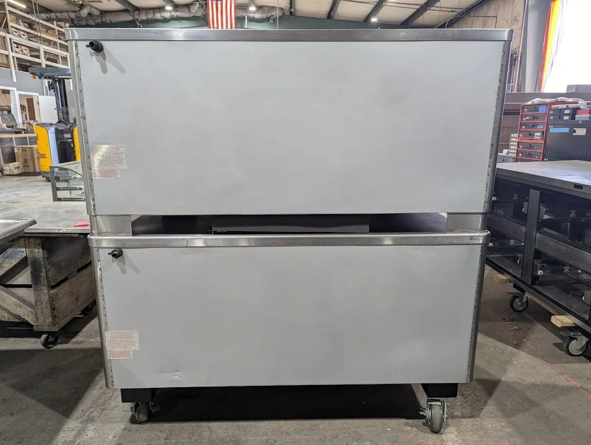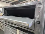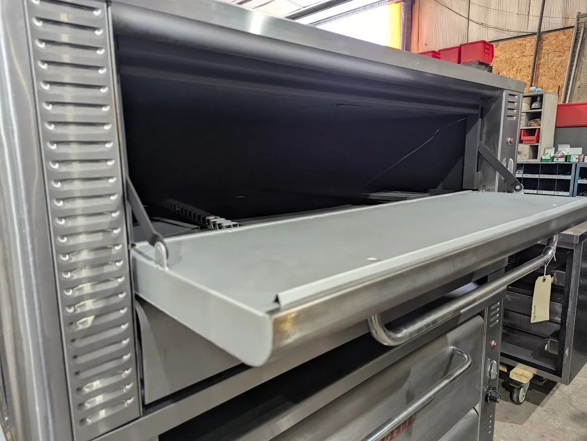 (USED) Natural gas, 48"W x 37"D deck interior, (2) 10" high sections, mechanical thermostat, QHT Rokite deck, spring assist door with concealed hinges, full angle iron frame, crown angle trim, stainless steel top, front and sides, 12" stainless steel legs, crown angle leg frame, flue connector, 85,000 BTU per section (170,000 BTU total), cETLus, NSF, CE, SN# 0914120AQ22B and 091412QA021T