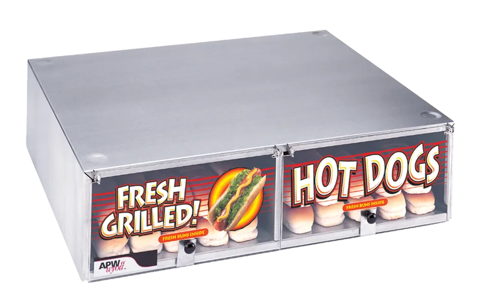 Bun Cabinets conveniently hold un-heated buns under the roller grill in easy reach of customers or clerk. The standard cabinet features stainless steel body with clear lift up Plexiglas doors, for product visibility and easy accessibility. Drawer model is a full stainless-steel unit with sliding door. The Bun Cabinet line is designed to complement our bestselling Hot Dog Roller Grill products. Available in variety of sizes to fit your counter space.