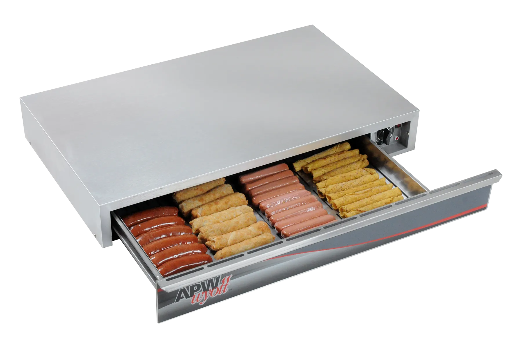 APW Wyott SPTU-50 Thermo Drawers are the perfect complement to your roller grill. Improve customer satisfaction with hot/fresh food in a timely fashion. It will improve your overall operations by minimizing waste and reducing labor all while adhering to HACCP food safety standards. Larger & Deeper drawer accommodates both standard & larger size products. Removable drawer utilizes heavy duty bearing/roller design for years of performance. Increase holding times for up to 6 hrs. without sacrificing quality and appearance of product. Saves space as it fits under current APW Wyott roller grills!