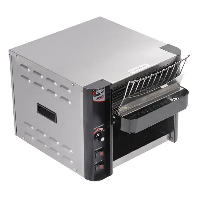 APW XTRM-1 Radiant Conveyor Toaster provides a 10" wide and 1.5" opening to allow 2-slices of toast to pass at one time. Produces over 350 slices per hour, with a small footprint, power saver switch reduces energy consumption and comes with lighted rocker switches as standard. Stainless steel housing with powder- coated aluminum front corners provides "cool touch" exteriors with metal sheathed heating elements.