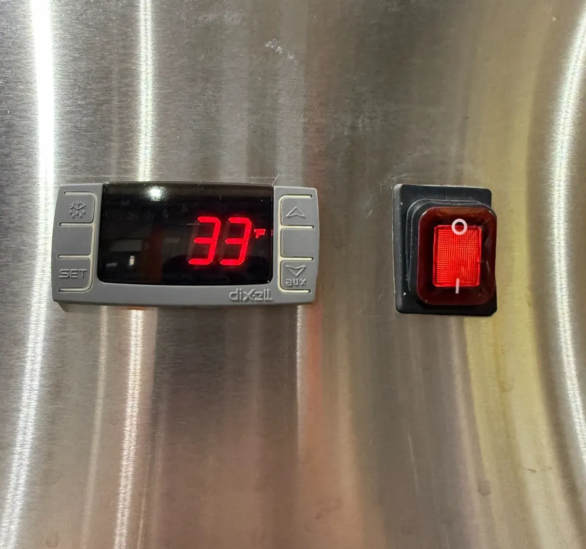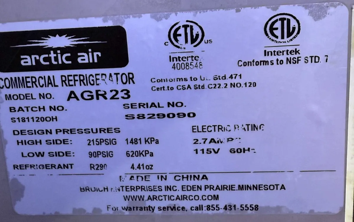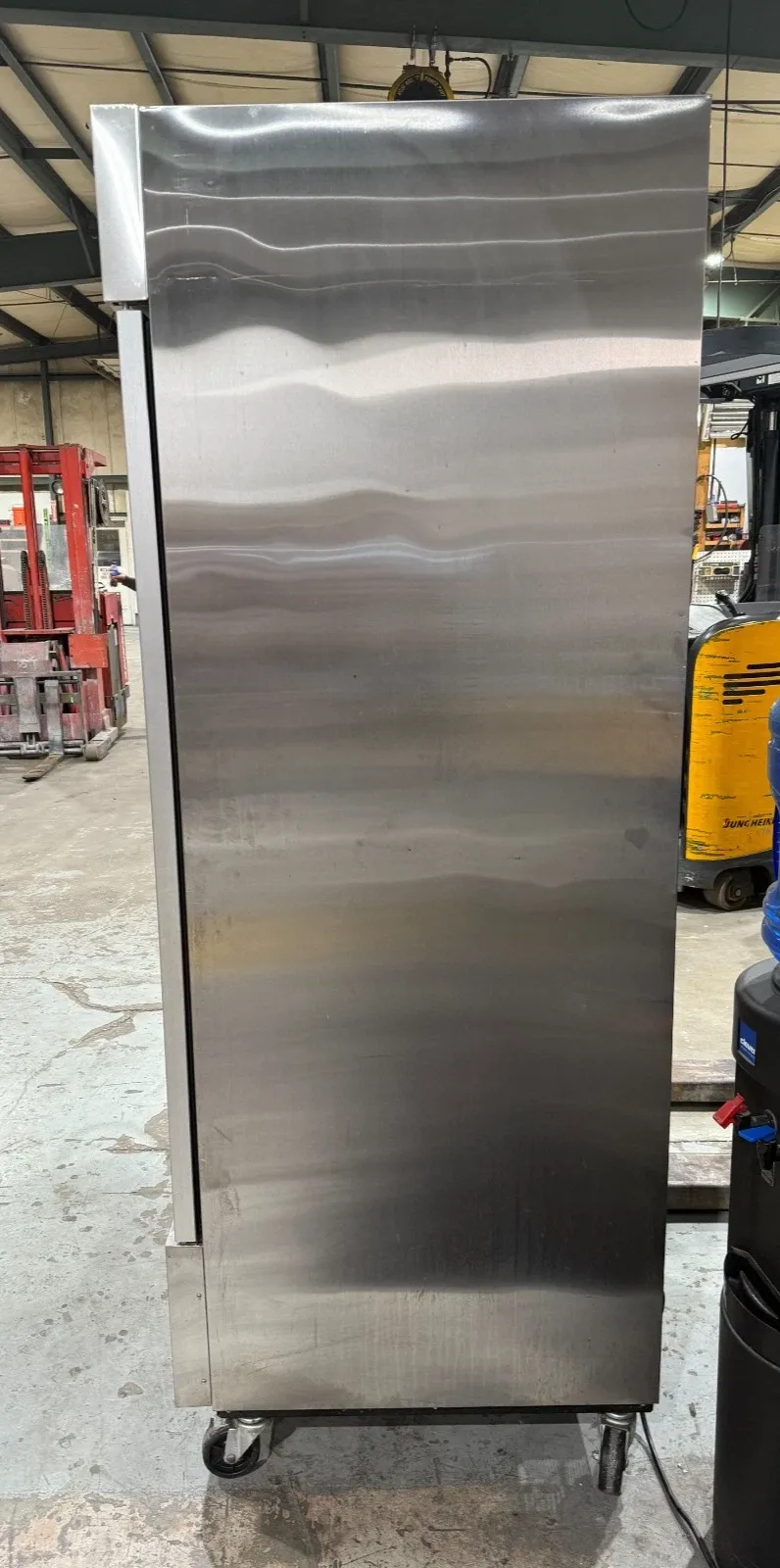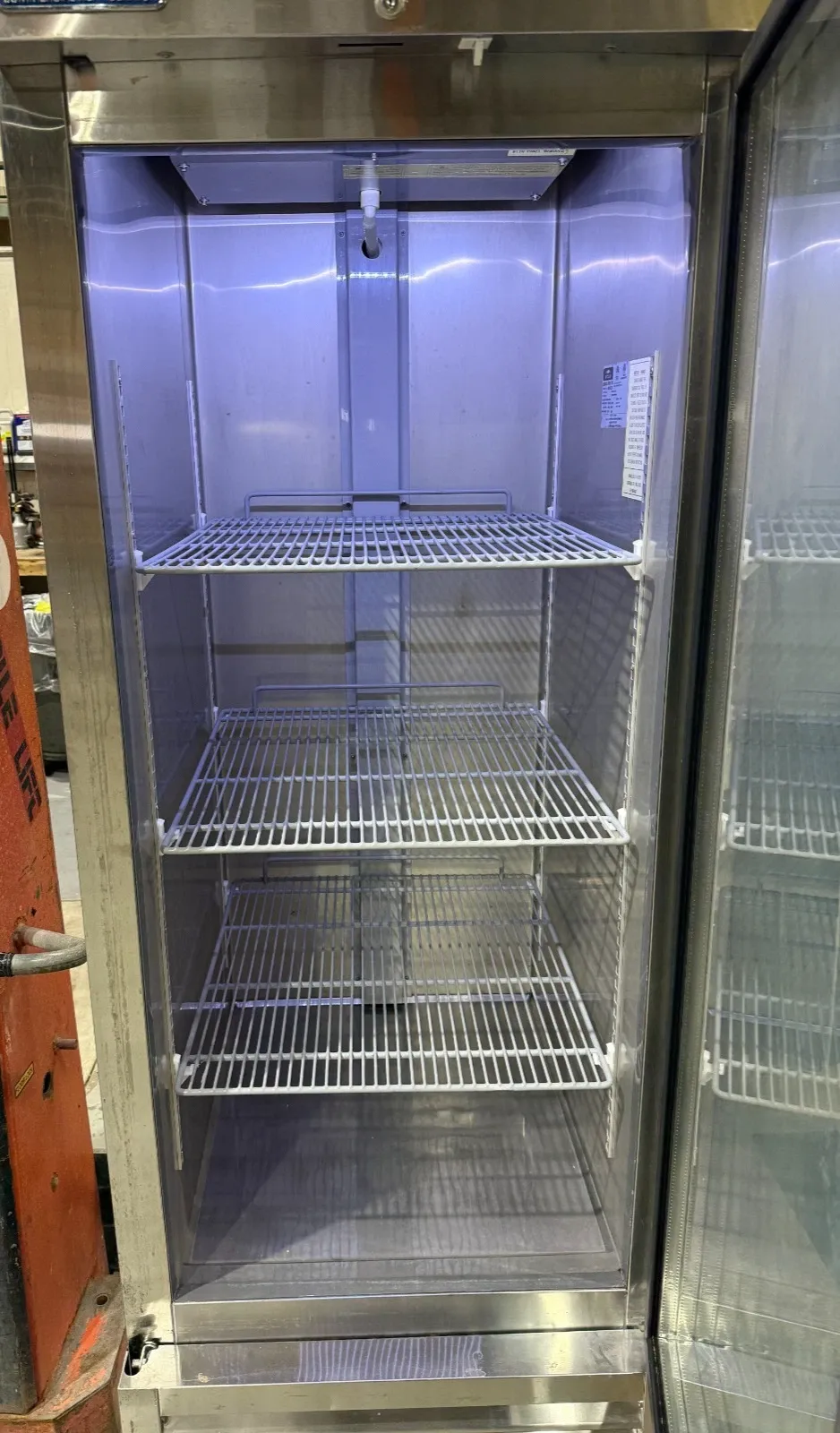 (USED) Refrigerator, reach-in, one-section, 27"W, 23.0 cu. ft. capacity, electronic thermostat with digital LED display, +33°F to +41°F temperature range, (1) glass right-hinged self-closing door with lock, removable magnetic door gasket, (3) adjustable wire shelves, interior LED light, stainless steel front & sides, stainless steel interior liner with stainless steel floor, (4) 5" casters (2 locking), bottom mounted self-contained refrigeration, R290 Hydrocarbon refrigerant, 1158 BTU/h rejected heated air gain, 1/3 HP,115v/60/1-ph, 2.6 amps, cord, NEMA 5-15P, cETLus, ETL-Sanitation