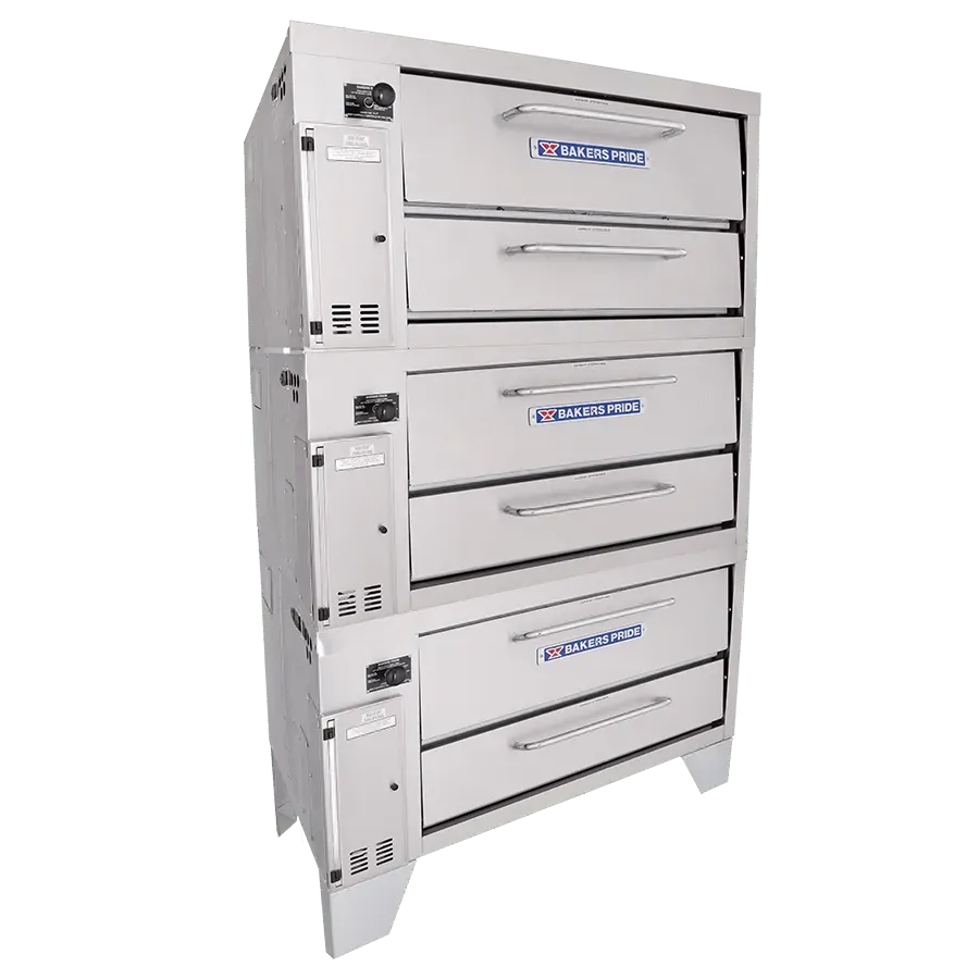 Ideal for kitchens with narrow aisles, the Bakers PrideĀ® model 153 triple-stacked gas pizza oven is designed with a shallow depth to save space while accommodating the high-volume needs of traditional cook lines. This triple-stacked oven features three Cordierite decks with 8" deck heights and independently controlled top and bottom heat dampers for perfectly balanced results. This 48" wide model is constructed with heavy-duty angle iron frame, which is fully welded to allow for stacking. The oven exterior is heavy-duty stainless steel and fully insulated for cooler outer temperatures and consistent interior temperatures.