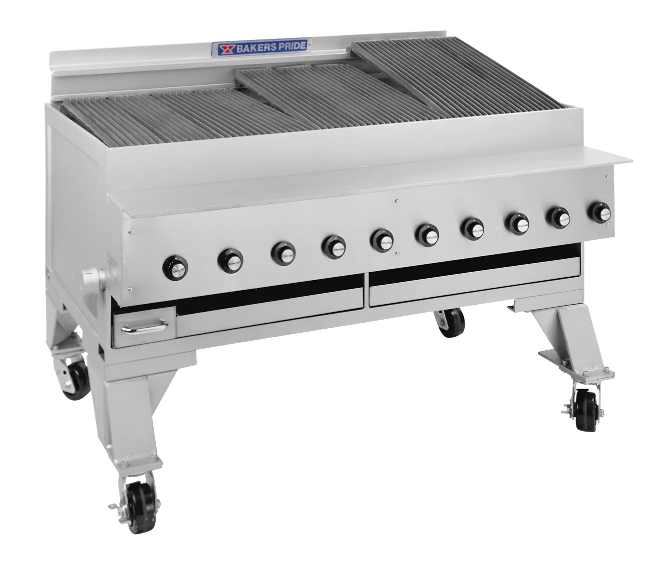 The Bakers PrideĀ® model CH-10 charbroiler is the perfect choice for high-volume broiling. It is constructed of extra heavy-duty plate steel for durability, and each of the ten burners has an output of 18,000 BTUH for energy efficiency yet high production. This model features cast-iron top grates, but you can also select other grate types such as floating rods and meat grates at no extra charge. Grates may be adjusted in three separate titling positions for increased flexibility and temperature control. Heavy-duty, stainless steel radiants come standard or can be substituted for cast iron. For even more versatility, choose from a wide variety of options, such as Glo-Stones and log holders for added flavor or casters for mobility. This charbroiler can also be built in with stone, brick, or masonry for exhibition kitchens.