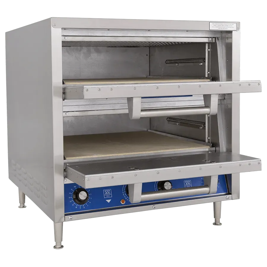 The Bakers Pride® model DP-2 oven features two independently controlled baking chambers, each with one Cordierite deck and a 5.5" deck height. The greater deck height allows you to accommodate all kinds of bakery items from pizzas to muffins to souffles. The incoloy heating elements and aluminized steel baking chambers are perfect for high heat, while the electronic timers allow for easy and precise operation. This model also features a stainless steel exterior and comes with 4” adjustable legs. International voltages are available.