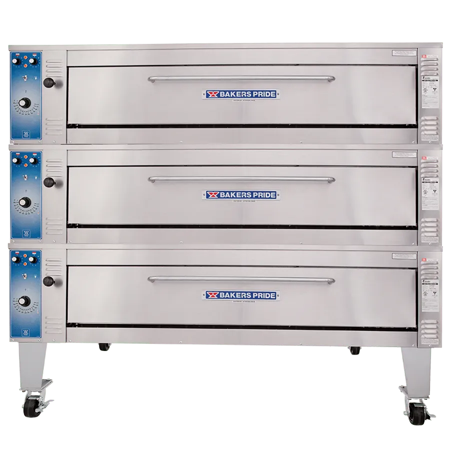 The Bakers Pride® model EP-3-8-5736 pizza oven is ideal for high-volume restaurants, offering the same durability and performance as our gas deck ovens with the low maintenance of an electrical system. This triple-stacked model has three Cordierite decks with 7” deck heights. The independently controlled, U-shaped heating elements on top and bottom allow for uniform temperatures and perfectly balanced baking. This model is constructed with heavy-duty, .25" angle iron frame, which is fully welded to allow for stacking. Other options are available to accommodate the configuration of your kitchen, such as side-mounted controls and special-height legs.