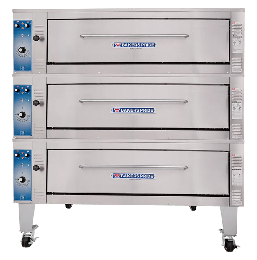 The Bakers Pride® model ER-3-12-3836 pizza oven is ideal for high-volume restaurants, offering the same durability and performance as our gas deck ovens but with the low maintenance of an electrical system. This triple-stacked model has three steel decks with 12” deck heights. In each oven, the independently controlled, U-shaped heating elements on top and bottom allow for uniform temperatures and perfectly balanced baking. This model is constructed with heavy-duty, .25" angle iron frame, which is fully welded to allow for stacking.