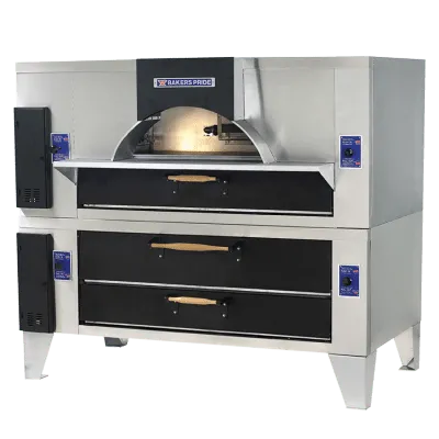 The Bakers PrideĀ® model FC-516/451 pizza oven combines our Il Forno Classico oven with the 451 oven to add ambiance while doubling cooking capacity for the ultimate exhibition pizza kitchen. The top features a steel-reinforced, arched opening with a visible, open-flame burner to make loading pizzas easy while create dining atmosphere. This model is constructed with heavy-duty, .25" angle iron frame, which is fully welded to allow for stacking. It is designed to be built in behind a decorative facade of brick, stone, or tile for a traditional, old-world look, or you can simply display it in stainless steel or finish it with black-powder-coated control panels and hardwood door handles for an elegant presentation. The top oven has a Cordierite deck with 10" deck height, while the bottom oven has a Cordierite deck with 8" deck height. Each oven chamber features independently controlled top and bottom heat dampers for perfectly balanced results. Options are also available to accommodate the configuration of your kitchen.