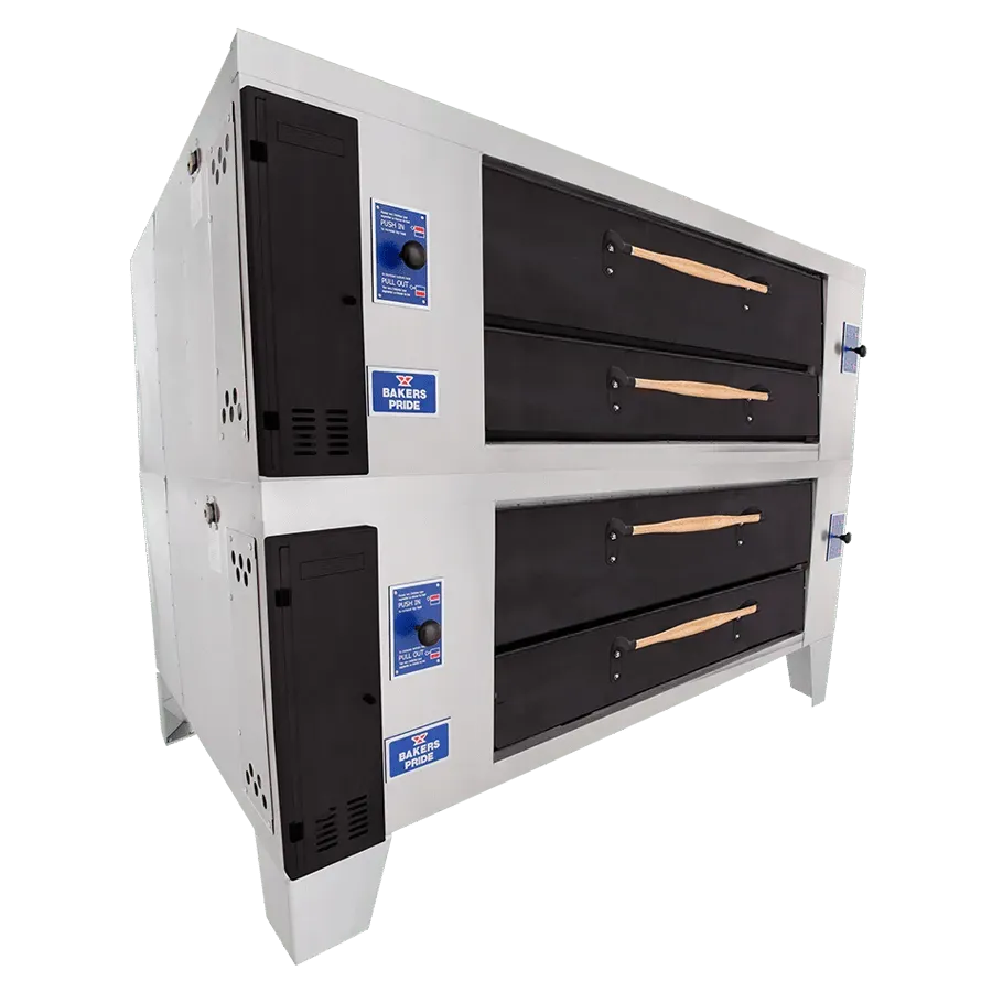 The Bakers Pride Y-DSP Series is a commercial double-stacked gas oven designed for professional kitchens. It features a brick-lined interior and a spacious Lightstone deck with 8" height that ensures even heat distribution for authentic pizza baking. Built with durable stainless steel and equipped with precise heat controls, this oven delivers consistently evenly baked results with independently controlled top and bottom heat dampers. The oven has multiple options to suit the configuration of your kitchen with a classic display style.