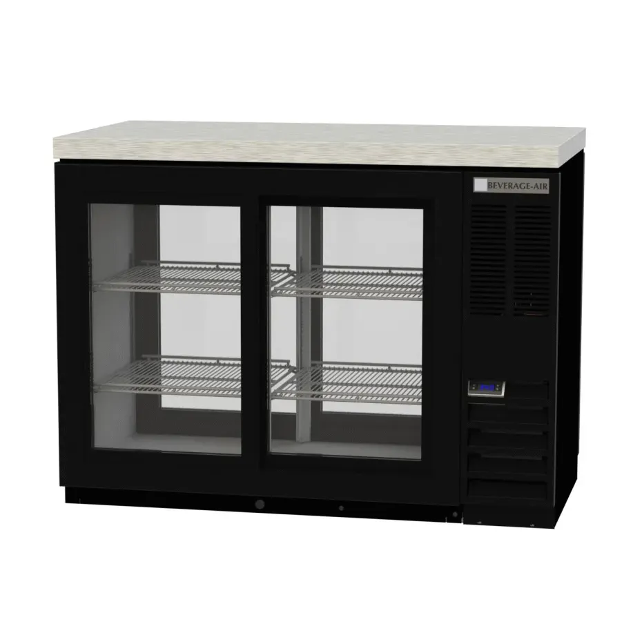 Ignite culinary passion with the Beverage Air BB48HC-1-GS-F-PT-S-27 Back Bar Cabinet. This refrigerated pass-thru storage cabinet is perfect for commercial restaurant use. With its two-section design and 48" width, it offers ample space to store and display your beverages and food items. The cabinet features four locking sliding glass doors, allowing easy access and visibility to your products. Inside, you'll find four epoxy coated steel shelves that can accommodate two 1/2 barrel kegs. The LED interior lighting enhances visibility, while the manual on/off switch gives you control. The stainless steel exterior with black frame doors not only adds a sleek look but also ensures durability. The stainless steel interior meets NSF-Standard 7 for open food containers, guaranteeing food safety. Powered by a 1/3 HP self-contained refrigeration system using R290 Hydrocarbon refrigerant, this cabinet is energy-efficient and environmentally friendly. Trust Beverage Air, a reputable brand known for its quality and reliability. Upgrade your restaurant with the BB48HC-1-GS-F-PT-S-27 Back Bar Cabinet today.
