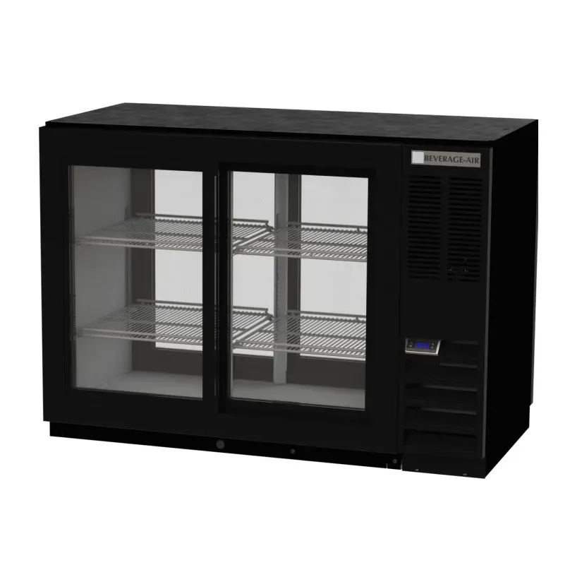 Elevate your dining experience with the Beverage Air BB48HC-1-GS-F-PT-S Back Bar Cabinet. This refrigerated pass-thru storage cabinet is designed to meet the needs of commercial restaurants, ensuring optimal food storage and easy access. With a spacious 13.6 cu. ft. capacity, this two-section cabinet features four locking sliding glass doors, allowing you to showcase your beverages while keeping them secure. The cabinet also includes four epoxy coated steel shelves, providing ample space for organizing and storing your products. The LED interior lighting with a manual on/off switch illuminates the cabinet, making it easy to locate items. Made in the USA, this cabinet is constructed with a stainless steel exterior and black frame doors, ensuring durability and a sleek appearance. The right-mounted self-contained refrigeration system, powered by a 1/3 HP motor and R290 Hydrocarbon refrigerant, keeps your beverages at the perfect temperature. NSF-Standard 7 certified for open food containers, this cabinet is also cULus and UL-Sanitation listed, guaranteeing its safety and quality. Upgrade your restaurant's storage capabilities with the Beverage Air BB48HC-1-GS-F-PT-S Back Bar Cabinet.