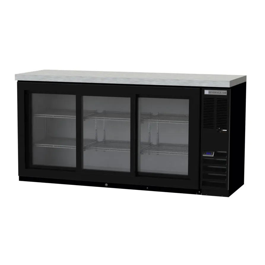 Unleash your inner chef with the Beverage Air BB72HC-1-F-GS-B-27 Back Bar Cabinet. This refrigerated storage cabinet is perfect for commercial restaurant use, offering a spacious three-section design with a 72" width and 36" height. With a capacity of 19.92 cu. ft., it can accommodate up to three 1/2 barrel kegs, making it ideal for storing and serving a variety of beverages. The cabinet features three locking sliding glass doors, allowing for easy access and visibility of the contents. The LED interior lighting, with a manual on/off switch, ensures that your products are showcased in the best possible light. The stainless steel interior with radius corners is not only easy to clean but also meets NSF-Standard 7 for open food containers, ensuring the highest standards of hygiene. The right-mounted self-contained refrigeration system, powered by a 1/3 HP compressor and using R290 Hydrocarbon refrigerant, provides efficient cooling while minimizing environmental impact. With its sleek black exterior finish and stainless steel top, this back bar cabinet is not only functional but also adds a touch of elegance to any restaurant setting. Trust Beverage Air, a reputable vendor in the industry, and elevate your restaurant's beverage storage capabilities with the BB72HC-1-F-GS-B-27 Back Bar Cabinet.