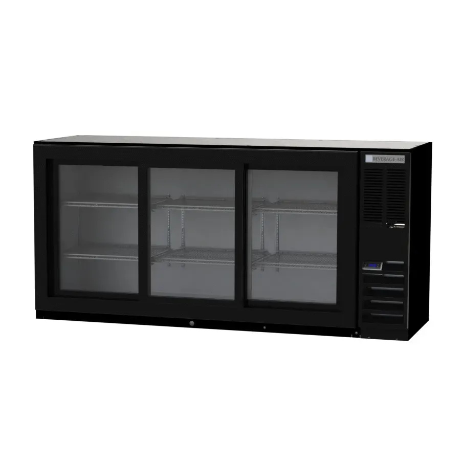 Unleash your kitchen's potential with the Beverage Air BB72HC-1-F-GS-B Back Bar Cabinet. This refrigerated storage cabinet is designed to meet the needs of commercial restaurants, offering a spacious three-section design with a 72" width and 19.92 cu. ft. capacity. The cabinet features three locking sliding glass doors, allowing for easy access and visibility of your stored items. With six epoxy coated steel shelves, you can organize and store up to three 1/2 barrel kegs, ensuring you have plenty of space for all your beverages. The LED interior lighting, with a manual on/off switch, illuminates the cabinet, making it easy to locate items even in low-light conditions. The black exterior finish and stainless steel interior not only provide durability but also give the cabinet a sleek and professional look. With its right-mounted self-contained refrigeration and R290 Hydrocarbon refrigerant, this cabinet is energy-efficient and environmentally friendly. Trust in the quality and reliability of Beverage Air, a trusted name in commercial refrigeration. Upgrade your restaurant's storage capabilities with the Beverage Air BB72HC-1-F-GS-B Back Bar Cabinet.