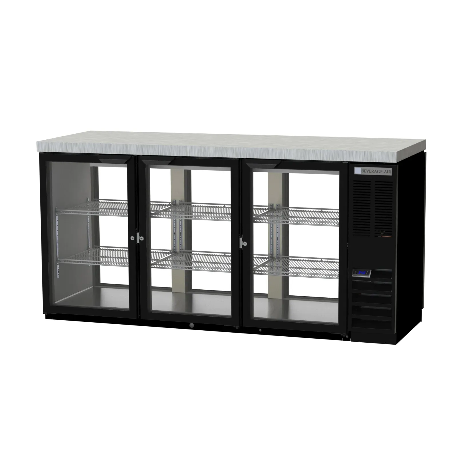 Revolutionize your cooking setup with the Beverage Air BB72HC-1-G-PT-B-27 Back Bar Cabinet. This refrigerated pass-thru storage cabinet is designed to meet the demands of a busy commercial restaurant. With its three-section design and 22.1 cu. ft. capacity, you'll have plenty of space to store and organize your beverages and ingredients. The cabinet features six glass doors with locks, allowing you to showcase your products while keeping them secure. Inside, you'll find six epoxy coated steel shelves that can accommodate three 1/2 barrel kegs. The LED interior lighting illuminates the cabinet, making it easy to find what you need. The 2" stainless steel top provides a durable workspace, while the black exterior finish adds a sleek and professional look to your establishment. With its right-mounted self-contained refrigeration and R290 Hydrocarbon refrigerant, this cabinet is energy-efficient and environmentally friendly. Trust Beverage Air, a reputable vendor known for their high-quality products, to deliver a reliable and efficient back bar cabinet for your restaurant.