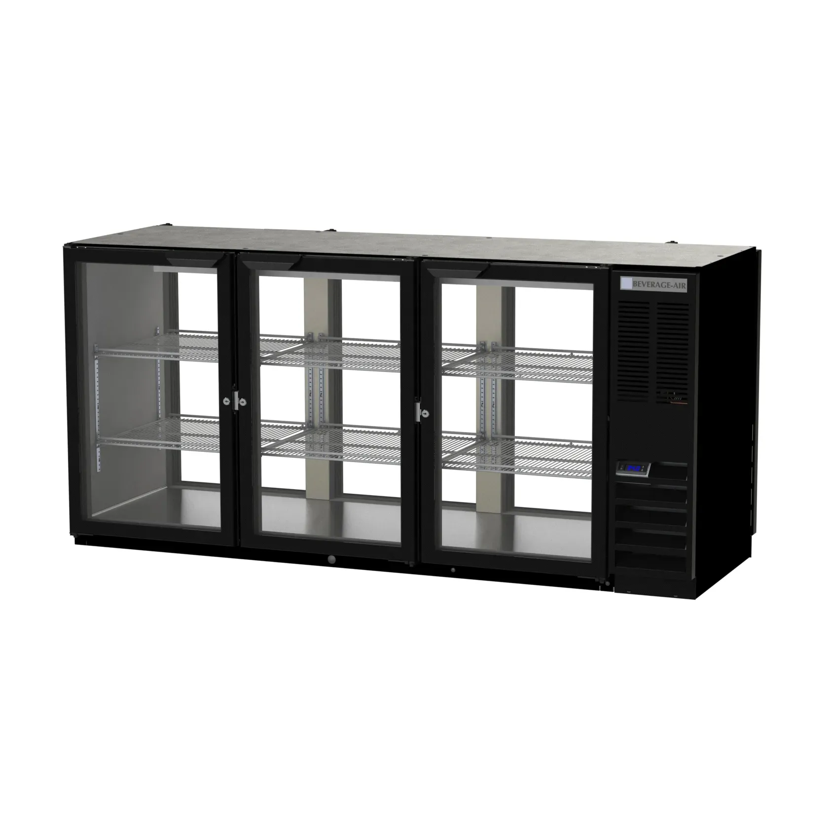 Realize kitchen dreams with the Beverage Air BB72HC-1-G-PT-B Back Bar Cabinet. This refrigerated pass-thru storage cabinet is a must-have for any commercial restaurant. With its three-section design and 72" width, it offers ample space for storing and displaying your beverages. The six glass doors, equipped with locks, not only provide easy access but also ensure the security of your valuable inventory. Inside, you'll find six epoxy-coated steel shelves that can accommodate up to three 1/2 barrel kegs. The LED interior lighting, with a manual on/off switch, illuminates your products, making them even more enticing to customers. The galvanized steel interior with a stainless steel floor ensures durability and easy cleaning. Plus, the right-mounted self-contained refrigeration system, powered by R290 Hydrocarbon refrigerant and a 1/3 HP compressor, keeps your beverages at the perfect temperature. Trust Beverage Air, a reputable brand known for its quality and reliability, to enhance your restaurant's beverage storage and display capabilities.
