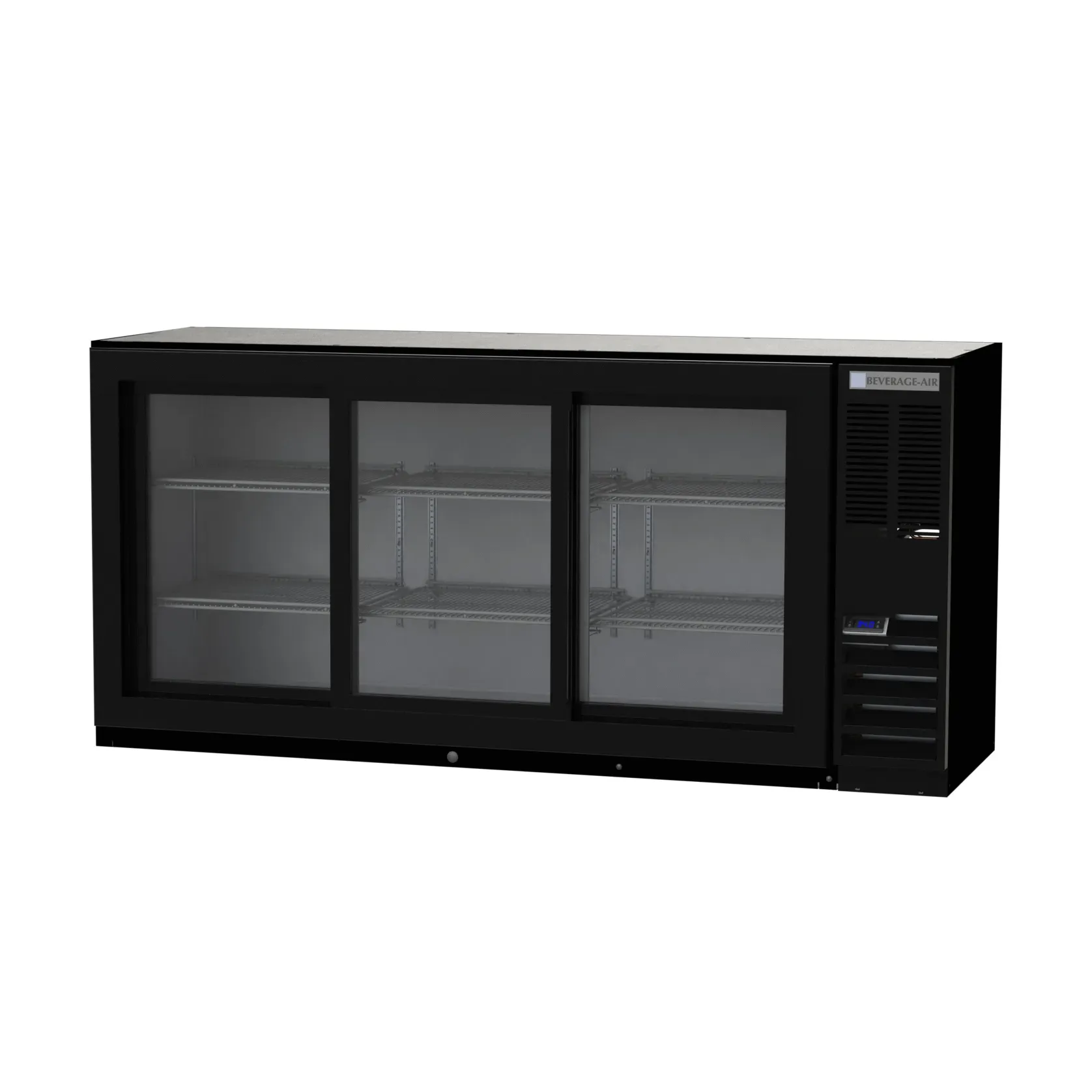 Introducing the Beverage Air BB72HC-1-GS-B Back Bar Cabinet, Refrigerated - the perfect addition to drive restaurant profitability. This refrigerated back bar storage cabinet is designed to meet the needs of commercial restaurants, offering a spacious three-section design with a 72"W size and 19.92 cu. ft. capacity. The cabinet features three locking sliding glass doors, ensuring the safety and security of your valuable inventory. With six epoxy coated steel shelves, you can easily organize and display your products for maximum visibility. The LED interior lighting, with a manual on/off switch, illuminates the cabinet, making it easy to locate items even in low-light conditions. The black exterior finish adds a sleek and professional look to any restaurant setting. Made in the USA, this back bar cabinet is UL EPH Classified and UL-Sanitation certified, guaranteeing its quality and durability. With its right-mounted self-contained refrigeration and R290 Hydrocarbon refrigerant, this cabinet is not only efficient but also environmentally friendly. Upgrade your restaurant's storage capabilities with the Beverage Air BB72HC-1-GS-B Back Bar Cabinet, Refrigerated.