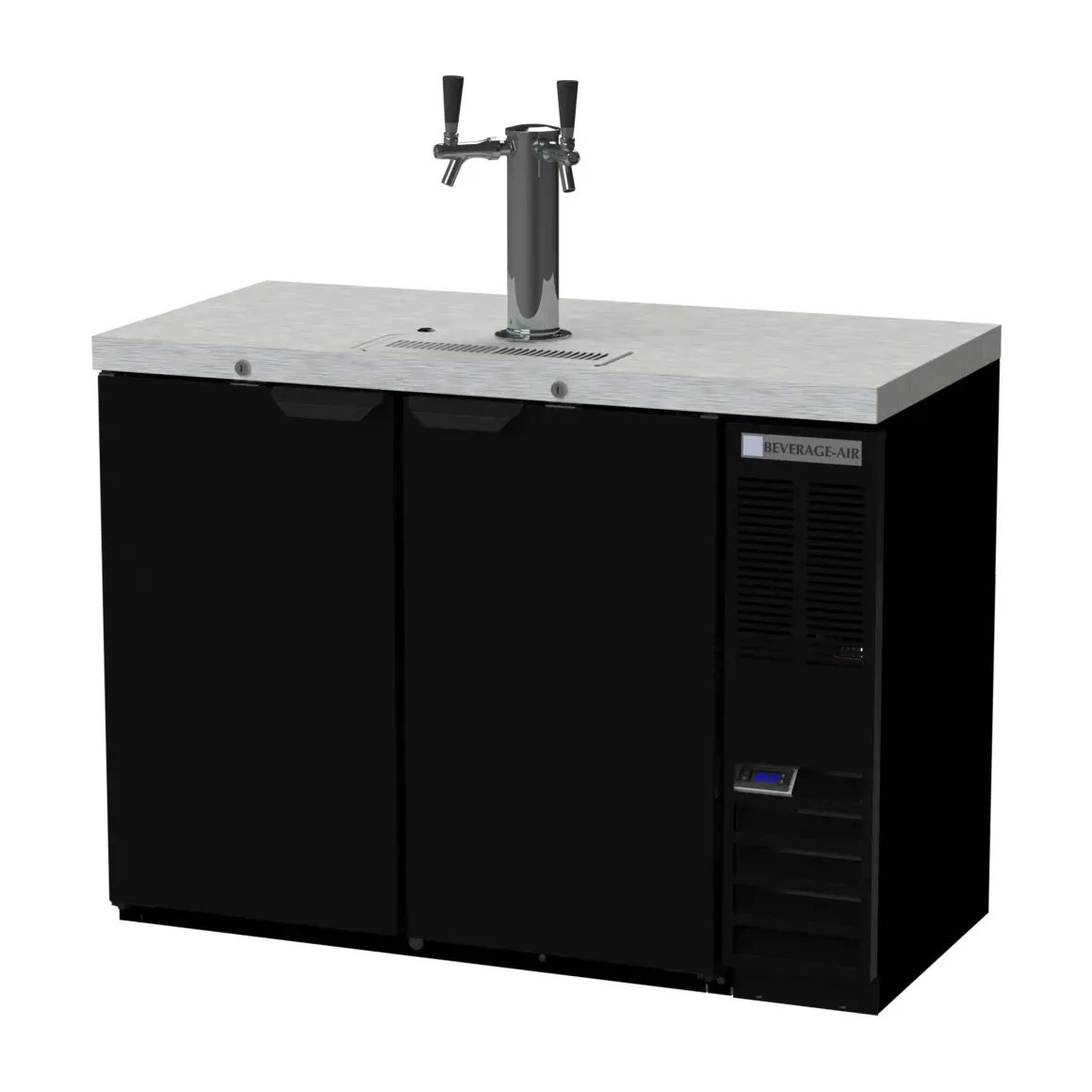 Cook with confidence and flair with the Beverage Air DD48HC-1-B Draft Beer Cooler. This commercial-grade cooler is designed to meet the needs of busy restaurants and bars, offering a spacious 48"W and 24-1/2"D interior with a capacity for two kegs. The black exterior and stainless steel top give it a sleek and professional look, while the galvanized interior with a reinforced stainless steel floor ensures durability and easy cleaning. The self-contained refrigeration system uses R290 Hydrocarbon refrigerant, making it energy-efficient and environmentally friendly. With door locks and a dual faucet column, you can securely store and serve your favorite draft beers. This draft beer cooler is cULus and UL EPH Classified, guaranteeing its safety and sanitation standards. Made in the USA by Beverage Air, this cooler is a reliable and high-quality addition to any commercial restaurant or bar.