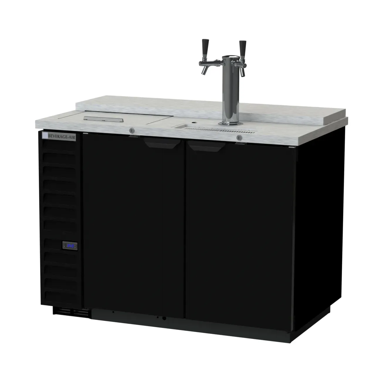 Introducing the Beverage Air DD50HC-1-C-B Draft Beer Cooler, a must-have for any commercial restaurant looking to dominate the culinary world. This club-type cooler is designed to meet the needs of busy establishments, with a spacious 17.86 cu. ft. capacity and two doors for easy access. The black exterior and stainless steel top give it a sleek and professional look, while the galvanized interior with a reinforced stainless steel floor ensures durability and longevity. With a self-contained refrigeration system and R290 Hydrocarbon refrigerant, this cooler is not only energy-efficient but also environmentally friendly. The dual faucet tower allows for convenient pouring, and the door locks provide added security. Made in the USA by Beverage Air, a trusted name in the industry, this draft beer cooler is UL EPH Classified and UL-Sanitation certified. Upgrade your restaurant's beverage service with the Beverage Air DD50HC-1-C-B Draft Beer Cooler.