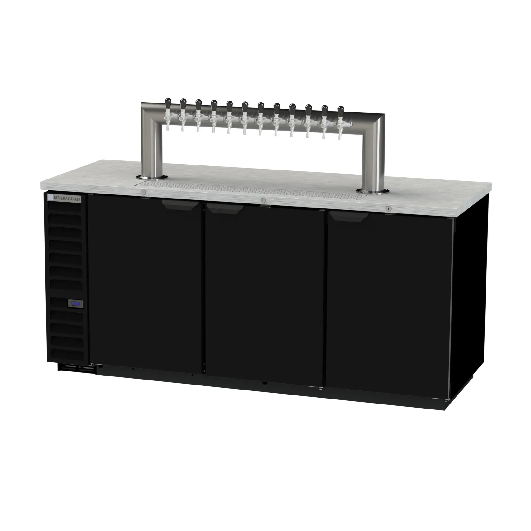 Transform your food service with the Beverage Air DD78HC-1-B-12T Draft Beer Cooler. This top-of-the-line cooler is designed to meet the needs of commercial restaurants, offering a spacious 33.59 cu. ft. capacity and the ability to hold up to four kegs. With its three doors and twelve-tap tower, this cooler allows for easy access and efficient service. The black exterior and stainless steel top give it a sleek and professional look, while the galvanized interior with a reinforced stainless steel floor ensures durability and longevity. The self-contained refrigeration system uses R290 Hydrocarbon refrigerant, making it environmentally friendly. Equipped with door locks, this cooler provides added security for your valuable inventory. Made in the USA and certified by cULus, UL EPH Classified, and UL-Sanitation, the Beverage Air DD78HC-1-B-12T Draft Beer Cooler is the perfect addition to any commercial restaurant looking to enhance its beverage service.