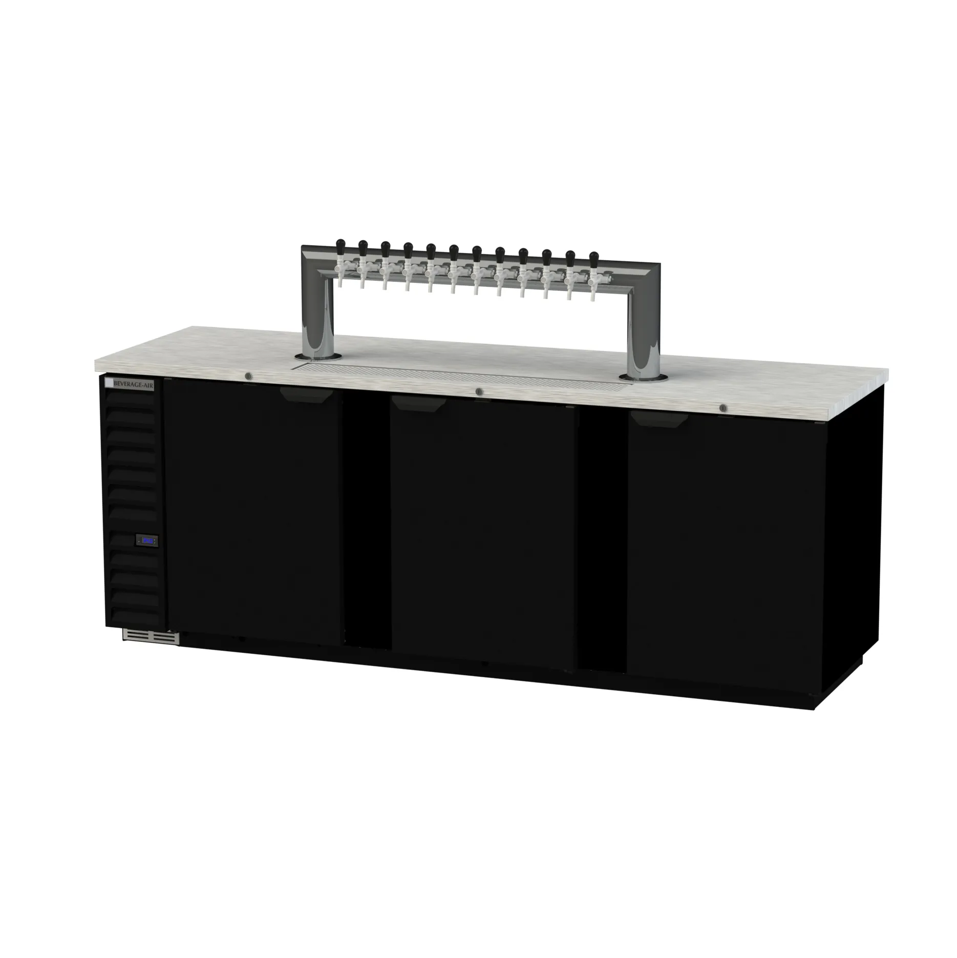 Master the art of cooking with the Beverage Air DD94HC-1-B-12T Draft Beer Cooler. This commercial-grade cooler is designed to meet the needs of busy restaurants and bars. With its spacious 37.82 cu. ft. capacity and three doors, it can hold up to five kegs, ensuring you always have a variety of beers on tap for your customers. The twelve-tap tower allows for efficient service, while the door locks provide added security. The black exterior and stainless steel top give this cooler a sleek and professional look, perfect for any commercial setting. Inside, the galvanized interior with a reinforced stainless steel floor is built to withstand heavy use and is easy to clean. The self-contained refrigeration system uses R290 Hydrocarbon refrigerant, making it energy-efficient and environmentally friendly. Trust Beverage Air, a trusted name in commercial refrigeration, and elevate your restaurant's beverage service with the DD94HC-1-B-12T Draft Beer Cooler.