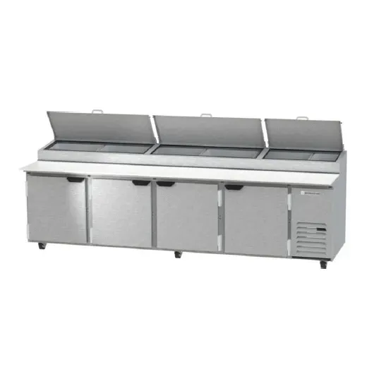 Introducing the Beverage Air DP119HC Refrigerated Counter, Pizza Prep Table - the perfect companion for culinary wizards looking to craft culinary wonders in their commercial restaurant. With its four-section design and spacious 119"W size, this pizza prep table offers a generous 42.2 cu. ft. of storage space, ensuring you have ample room to store all your ingredients and toppings. The stainless steel top comes with a refrigerated pan rail, allowing you to keep your ingredients fresh and easily accessible. Equipped with (4) doors and (8) shelves, this prep table offers maximum organization and efficiency. The 19" cutting board provides a convenient workspace for food preparation. Made in the USA and featuring side-mounted self-contained refrigeration, this unit is not only reliable but also energy-efficient. With its UL EPH Classified and UL-Sanitation certifications, you can trust that this prep table meets the highest standards of quality and safety. Elevate your culinary creations with the Beverage Air DP119HC Refrigerated Counter, Pizza Prep Table.