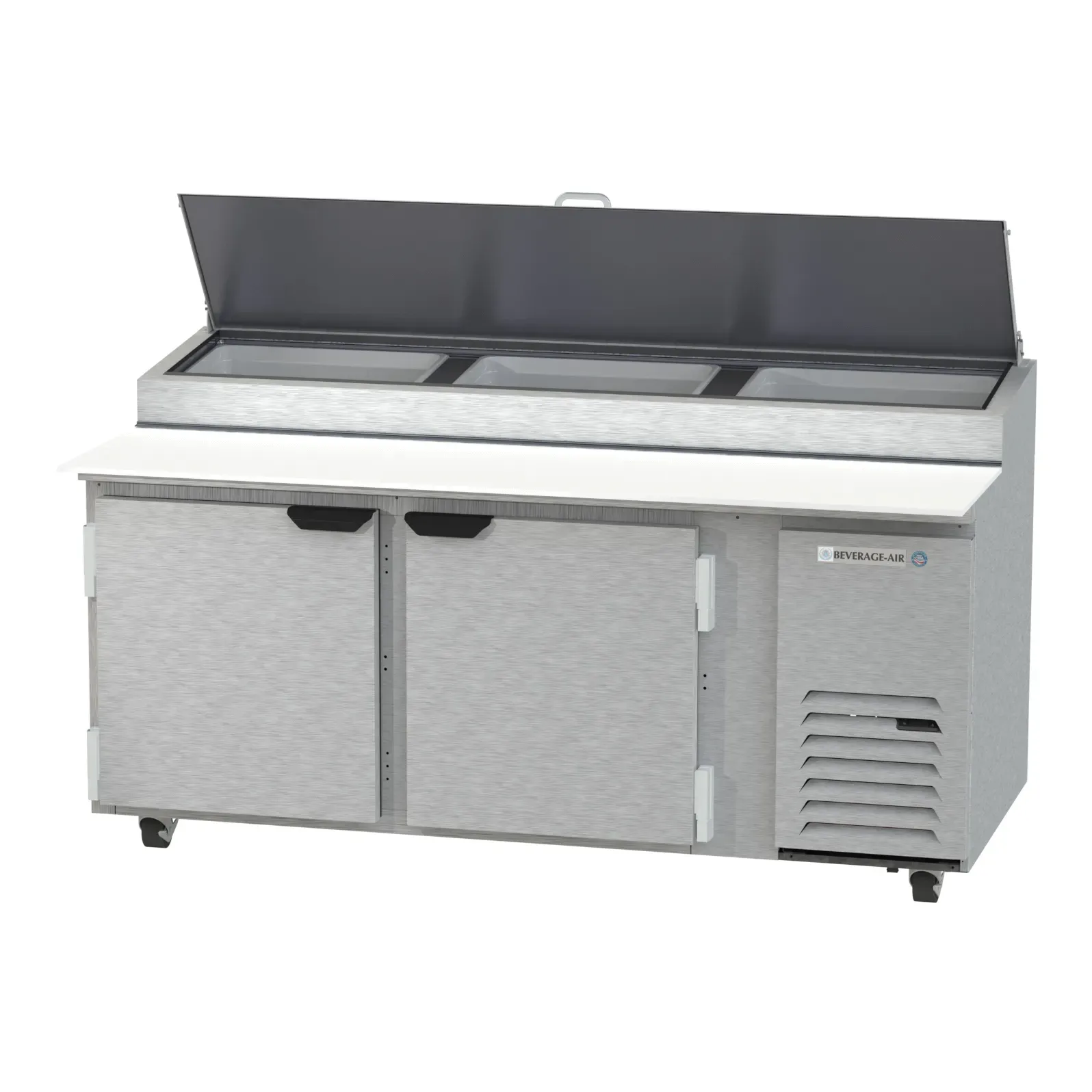 Maximize your food service potential with the Beverage Air DP72HC Refrigerated Counter, Pizza Prep Table. This two-section, 72"W table is designed to meet the demands of a busy commercial restaurant. With a spacious 22.8 cu. ft. capacity, it offers ample storage for your ingredients and supplies. The table features two doors and four shelves, allowing for easy organization and access to your items. The stainless steel top comes with a refrigerated pan rail, perfect for keeping your pizza toppings fresh and ready for use. Additionally, the 19" cutting board provides a convenient workspace for food preparation. The DP72HC is equipped with side-mounted self-contained refrigeration, ensuring efficient cooling and temperature control. Made in the USA and certified by cULus, UL EPH Classified, and UL-Sanitation, this prep table is a reliable and durable choice for any commercial kitchen.