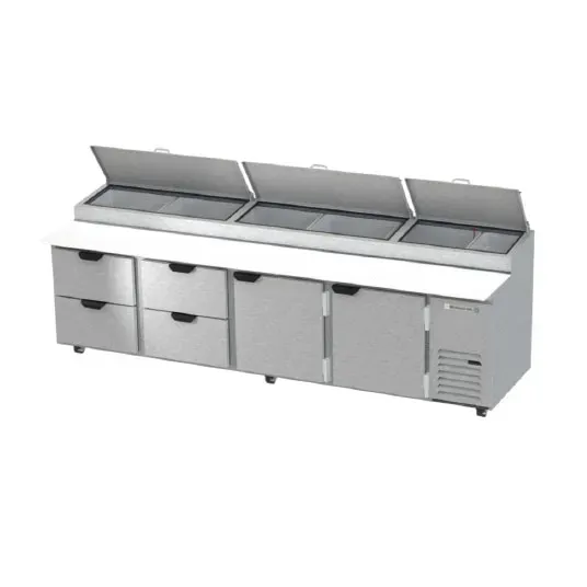 Unleash your kitchen's potential with the Beverage Air DPD119HC-4 Refrigerated Counter, Pizza Prep Table. This four-section unit is designed to meet the demands of a busy commercial restaurant. With a spacious 119" width and 42.2 cu. ft. capacity, it offers ample storage for all your ingredients. The unit features four drawers, two doors, and four shelves, providing convenient organization options. The stainless steel top comes with a refrigerated pan rail, perfect for keeping your pizza toppings fresh and easily accessible. The 19" cutting board allows for efficient food preparation, while the stainless steel front, sides, and top ensure durability and easy cleaning. The aluminum interior is both hygienic and resistant to corrosion. With side-mounted self-contained refrigeration and R290 Hydrocarbon refrigerant, this unit is energy-efficient and environmentally friendly. Trust in the quality and reliability of Beverage Air, a trusted name in commercial refrigeration. Upgrade your kitchen with the Beverage Air DPD119HC-4 Refrigerated Counter, Pizza Prep Table.