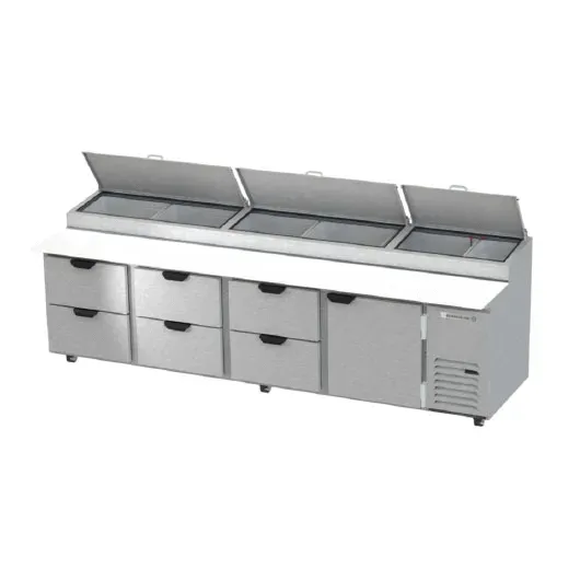 Achieve kitchen supremacy with the Beverage Air DPD119HC-6 Refrigerated Counter, Pizza Prep Table. This four-section unit is designed to meet the demands of a busy commercial restaurant. With a spacious 119" width and 42.2 cu. ft. capacity, it offers ample storage for all your ingredients. The table features six drawers, one door, and two shelves, providing convenient organization options. The stainless steel top comes with a refrigerated pan rail, perfect for keeping your toppings fresh and easily accessible. The 19" cutting board allows for efficient food preparation, while the stainless steel front, sides, and top ensure durability and easy cleaning. The aluminum interior and side-mounted self-contained refrigeration system guarantee optimal temperature control. Made in the USA and certified by cULus, UL EPH Classified, and UL-Sanitation, this Beverage Air Refrigerated Counter is a reliable and efficient addition to any commercial kitchen.