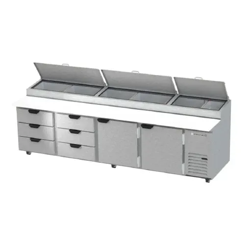 Equip your commercial kitchen with the Beverage Air DPD119HC-6T Refrigerated Counter, Pizza Prep Table. This four-section unit is designed to meet the demands of a busy restaurant kitchen. With a spacious 119" width and 42.2 cu. ft. capacity, it offers ample storage for all your ingredients. The table features six drawers, two doors, and four shelves, providing convenient organization options. The stainless steel top comes with a refrigerated pan rail, perfect for keeping your pizza toppings fresh and easily accessible. Additionally, the 19" cutting board allows for efficient food preparation. The unit is made with a durable stainless steel front, sides, and top, ensuring longevity in a commercial setting. The aluminum interior is easy to clean and maintain. With side-mounted self-contained refrigeration and R290 Hydrocarbon refrigerant, this table is energy-efficient and environmentally friendly. Trust in the quality and reliability of Beverage Air, a trusted name in commercial refrigeration.
