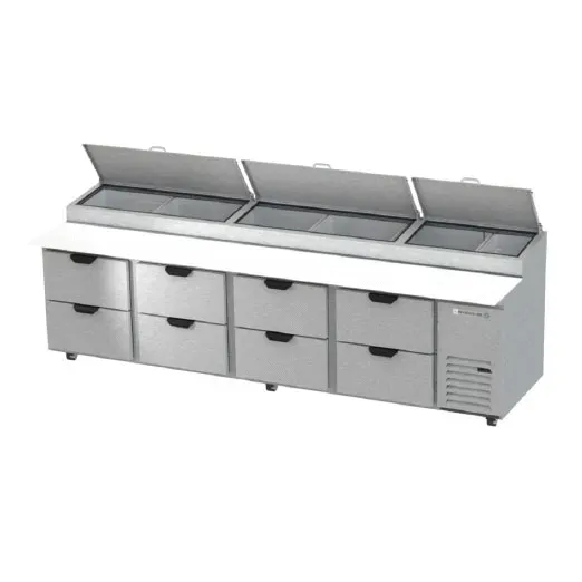 Equip your kitchen for success with the Beverage Air DPD119HC-8 Refrigerated Counter, Pizza Prep Table. This four-section unit is designed to meet the demands of a busy commercial restaurant. With a spacious 119" width and 42.2 cu. ft. capacity, it provides ample storage for all your ingredients. The table features eight drawers, perfect for organizing and accessing your supplies efficiently. It also has a stainless steel top with a refrigerated pan rail, allowing you to keep your toppings cool and fresh. The 19" cutting board provides a convenient workspace for preparing pizzas. Made in the USA with high-quality stainless steel construction, this unit is built to last. The side-mounted self-contained refrigeration system ensures optimal cooling performance. With its UL EPH Classified and UL-Sanitation certifications, you can trust that this prep table meets the highest standards of safety and sanitation. Upgrade your kitchen with the Beverage Air DPD119HC-8 Refrigerated Counter, Pizza Prep Table and experience enhanced efficiency and productivity.