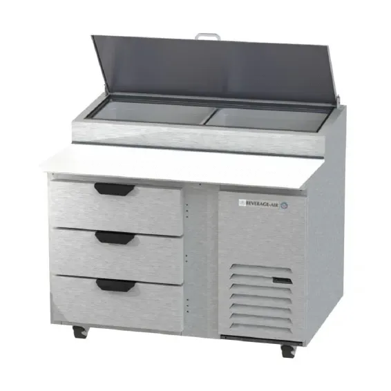 Serve with pride with the Beverage Air DPD46HC-3 Refrigerated Counter, Pizza Prep Table. This one-section, 46"W table is designed to meet the needs of commercial restaurants, offering a spacious 12 cu. ft. capacity and three drawers for convenient storage. With a stainless steel top and refrigerated pan rail, this table can accommodate two full-size pans, making it perfect for preparing and serving pizzas. The 19" cutting board provides ample space for slicing and dicing ingredients, while the stainless steel front, sides, and top ensure durability and easy cleaning. The aluminum interior and side-mounted self-contained refrigeration system guarantee efficient cooling and temperature control. Made in the USA and certified by cULus, UL EPH Classified, and UL-Sanitation, this Beverage Air Refrigerated Counter is a reliable and high-quality addition to any commercial kitchen.