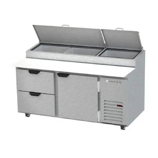 Cook with confidence and flair using the Beverage Air DPD67HC-2 Refrigerated Counter, Pizza Prep Table. This two-section, 67"W table is designed to meet the demands of a busy commercial restaurant kitchen. With a spacious 20.7 cu. ft. capacity, it offers ample storage for all your ingredients and supplies. The table features two drawers, one door, and two shelves, providing convenient organization options. The stainless steel top comes with a refrigerated pan rail, allowing you to keep your pizza toppings fresh and easily accessible. The 19" cutting board provides a convenient workspace for food preparation. Made in the USA, this table is built to last with its stainless steel front, sides, and top, as well as its aluminum interior. The side-mounted self-contained refrigeration system ensures efficient cooling, while the R290 Hydrocarbon refrigerant is environmentally friendly. Trust Beverage Air for reliable and high-quality refrigeration equipment for your restaurant.