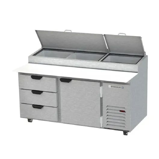 Serve with pride with the Beverage Air DPD67HC-3 Refrigerated Counter, Pizza Prep Table. This two-section table is designed to meet the needs of busy commercial restaurants, offering a spacious 67" width and 20.7 cu. ft. capacity. With three drawers, one door, and two shelves, you'll have plenty of storage options for your ingredients and supplies. The stainless steel top features a refrigerated pan rail, perfect for keeping your pizza toppings fresh and easily accessible. The 19" cutting board provides a convenient workspace for food preparation. Made in the USA with high-quality stainless steel and aluminum, this prep table is built to last. The side-mounted self-contained refrigeration system ensures efficient cooling, while the R290 Hydrocarbon refrigerant is environmentally friendly. With its cULus and UL-Sanitation certifications, you can trust the reliability and safety of this Beverage Air prep table. Upgrade your restaurant's efficiency and organization with the DPD67HC-3 Refrigerated Counter, Pizza Prep Table.