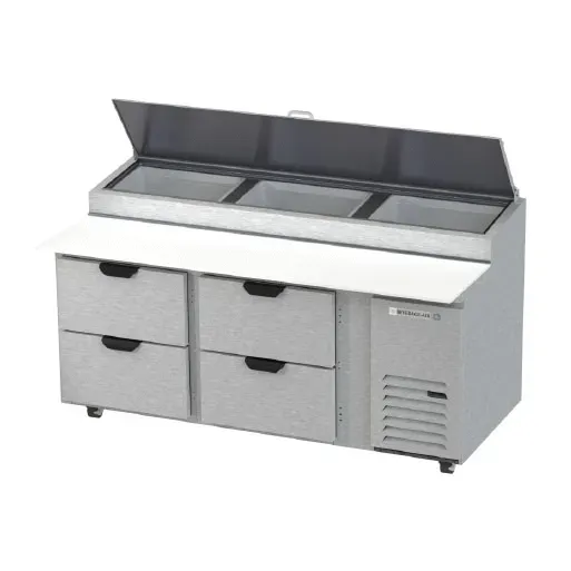 Cooking at its finest begins with the Beverage Air DPD72HC-4 Refrigerated Counter, Pizza Prep Table. This two-section table is designed to meet the demands of a busy commercial restaurant kitchen. With a spacious 72" width and 22.8 cu. ft. capacity, it offers ample storage for all your ingredients and supplies. The table features four drawers and a refrigerated pan rail on top, capable of holding three full-size pans. It also comes with a convenient 19" cutting board for easy food preparation. Made in the USA with a stainless steel front, sides, and top, as well as an aluminum interior, this prep table is built to last. The side-mounted self-contained refrigeration system ensures efficient cooling, while the use of R290 Hydrocarbon refrigerant makes it environmentally friendly. With its cULus and UL-Sanitation certifications, you can trust the quality and safety of this Beverage Air prep table. Upgrade your kitchen with the DPD72HC-4 and experience the difference in performance and durability.