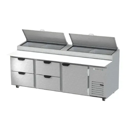 Optimize your kitchen efficiency with the Beverage Air DPD93HC-4 Refrigerated Counter, Pizza Prep Table. This three-section unit is designed to streamline your restaurant operations and enhance productivity. With a spacious 93" width and 31.5 cu. ft. capacity, it offers ample storage for your ingredients and supplies. The unit features four drawers and one door, providing easy access to your items. The stainless steel top comes with a refrigerated pan rail, allowing you to keep your toppings cool and fresh. Additionally, the 19" cutting board provides a convenient workspace for food preparation. Made in the USA, this pizza prep table is built to last with its durable stainless steel front, sides, and top, as well as an aluminum interior. The side-mounted self-contained refrigeration system ensures efficient cooling, while the R290 Hydrocarbon refrigerant is environmentally friendly. Trust Beverage Air to deliver a high-quality, reliable refrigerated counter that meets all cULus, UL EPH Classified, and UL-Sanitation standards. Upgrade your kitchen with the Beverage Air DPD93HC-4 Refrigerated Counter, Pizza Prep Table and experience improved efficiency and functionality.