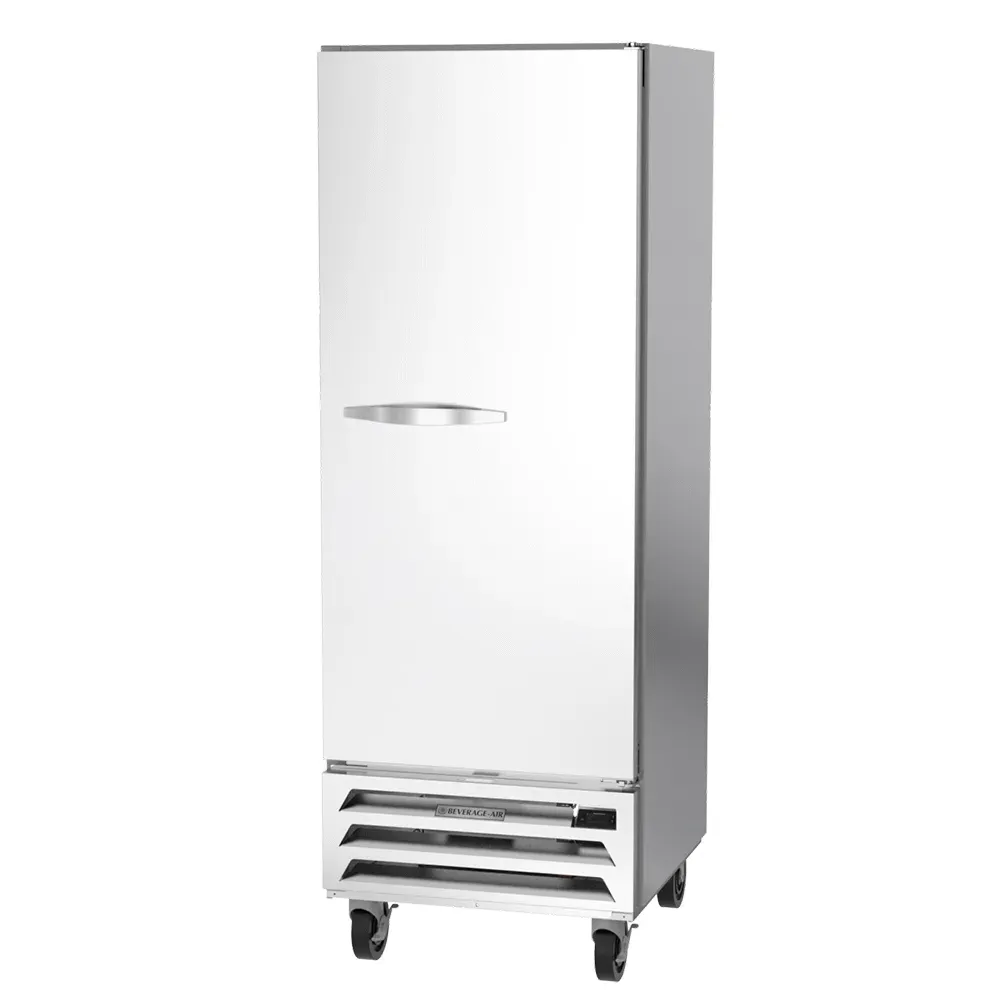 Introducing the Beverage Air FB12HC-1S Freezer, Reach-In - the perfect solution to simplify restaurant operations. This one-section reach-in freezer is designed to optimize storage space and enhance efficiency in any commercial kitchen. With a generous capacity of 11.8 cu. ft., this freezer provides ample room for storing a wide variety of frozen ingredients and prepared dishes. The electronic control ensures precise temperature management, while the automatic defrost feature eliminates the need for manual maintenance. The lockable hinged solid door provides added security, and the four adjustable wire shelves allow for customizable organization. The LED interior lighting illuminates the contents, making it easy to locate items quickly. Made in the USA with a stainless steel front and gray coated steel sides, this freezer is not only durable but also visually appealing. With bottom-mounted self-contained refrigeration and R290 Hydrocarbon refrigerant, this unit is energy-efficient and environmentally friendly. Trust Beverage Air FB12HC-1S to streamline your restaurant operations and keep your ingredients fresh and accessible.