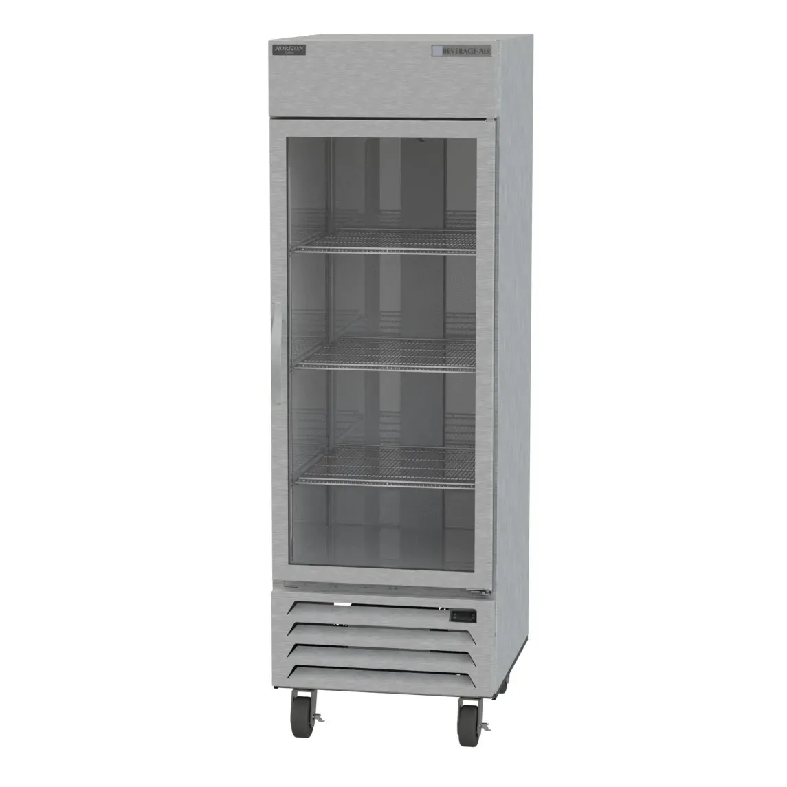Achieve kitchen supremacy with the Beverage Air HBF23HC-1-G Freezer, Reach-In. This Horizon Series freezer is designed to meet the demands of a commercial restaurant, offering a spacious 22.5 cu. ft. capacity to store all your frozen goods. The right-hand hinged glass door provides easy access and allows you to showcase your products to customers. With three adjustable shelves, you can customize the interior layout to accommodate items of various sizes. The electronic control and digital display make it easy to monitor and adjust the temperature, ensuring optimal food preservation. The expansion valve technology and automatic defrost feature further enhance efficiency and convenience. Made in the USA, this freezer boasts a durable stainless steel interior and exterior, ensuring longevity and easy cleaning. The R290 Hydrocarbon refrigerant and bottom-mounted self-contained refrigeration system contribute to energy efficiency and reduced environmental impact. Trust Beverage Air to deliver reliable and high-quality refrigeration solutions for your commercial kitchen.