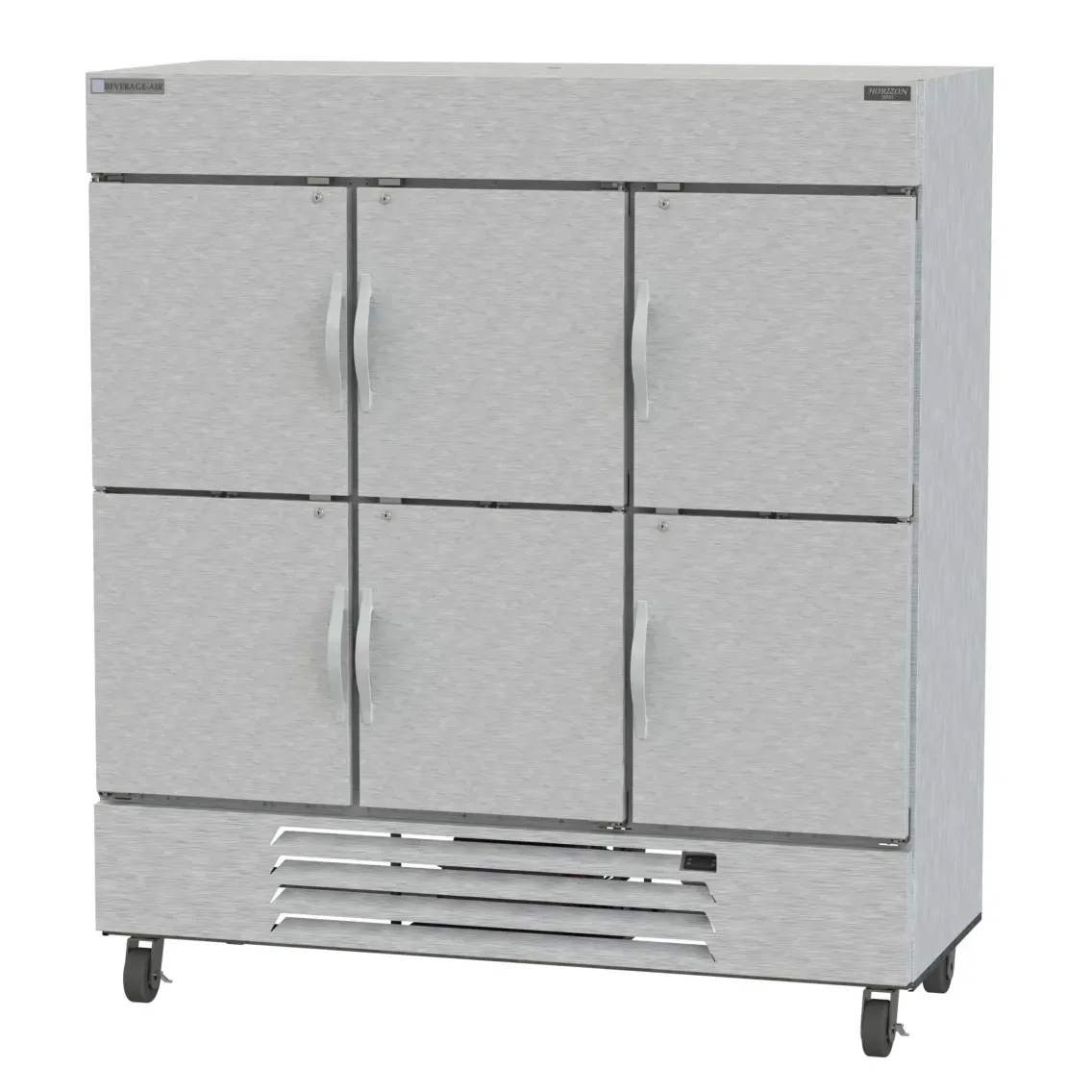 Master the art of cooking with the Beverage Air HBF72HC-5-HS Freezer, Reach-In. This Horizon Series freezer is designed to meet the demands of a busy commercial restaurant. With its three-section layout and a spacious 68.5 cu. ft. capacity, you'll have plenty of room to store all your ingredients and prepared dishes. The freezer features two center solid half doors, two right solid half doors, and two left solid half doors, all equipped with door locks for added security. The nine adjustable shelves allow for flexible storage options, while the electronic control and digital display make it easy to monitor and adjust the temperature. The LED interior lighting ensures excellent visibility, and the stainless steel interior and exterior provide durability and a sleek appearance. With bottom-mounted self-contained refrigeration and automatic defrost, maintenance is a breeze. Made in the USA and certified by cULus, UL EPH Classified, and UL-Sanitation, this Beverage Air freezer is a reliable and efficient addition to any commercial kitchen.