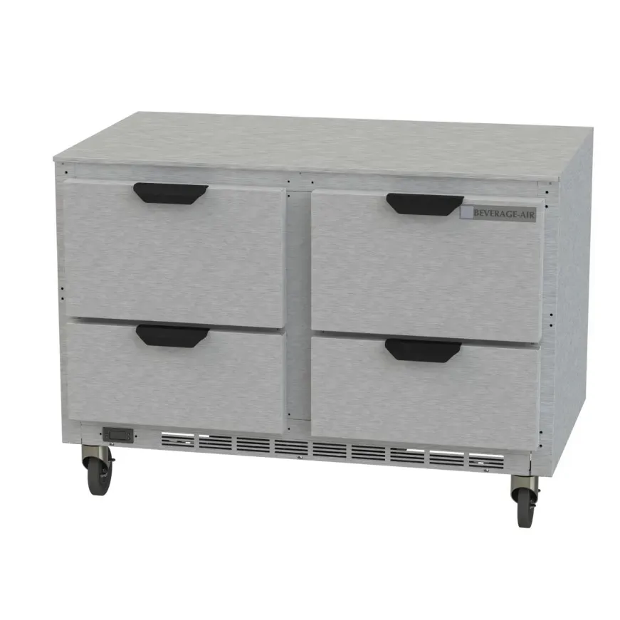 Discover kitchen perfection with the Beverage Air UCFD48AHC-4 Undercounter Freezer. This two-section freezer is designed to meet the demands of a busy commercial restaurant. With a spacious 48" width and 11.16 cu. ft. capacity, it provides ample storage space for all your frozen ingredients and products. The freezer features four drawers, allowing for easy organization and access to your items. Its stainless steel exterior and top not only give it a sleek and professional look but also ensure durability and easy cleaning. The aluminum interior is both hygienic and resistant to corrosion. The rear-mounted self-contained refrigeration system keeps your products at the perfect temperature, while the R290 Hydrocarbon refrigerant is environmentally friendly. With a 1/2 HP compressor, this freezer is powerful and efficient. It is cULus and UL-Sanitation listed, guaranteeing its safety and reliability. Upgrade your kitchen with the Beverage Air UCFD48AHC-4 Undercounter Freezer and experience the convenience and quality it brings to your restaurant.
