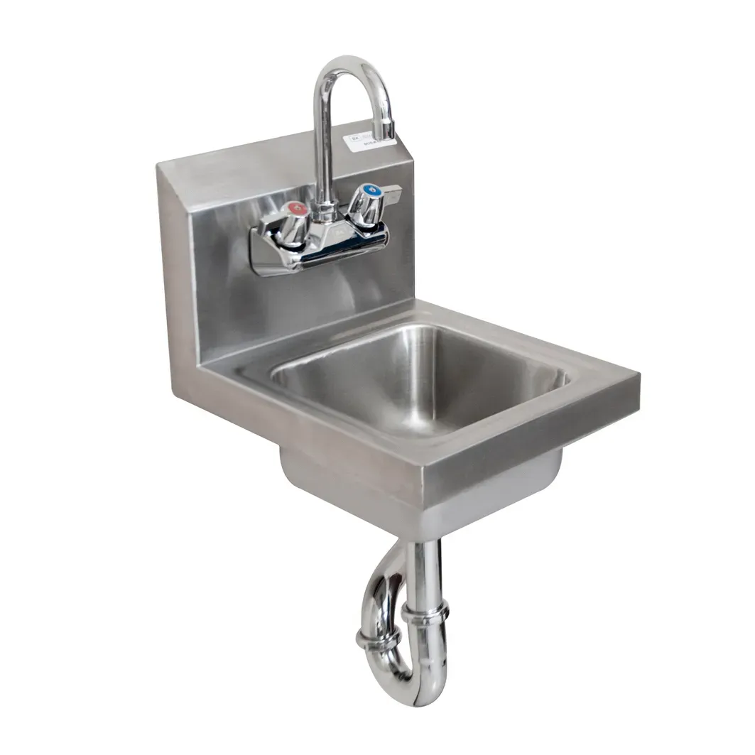 Enhance the heart of your restaurant with the BK Resources BKHS-W-SS-PT-G Hand Sink. This space-saving hand sink is perfect for any commercial restaurant setting. With its compact design, measuring 9" wide x 9" front-to-back x 5" deep, it can easily fit into tight spaces without sacrificing functionality. The 304 stainless steel construction ensures durability and longevity, making it ideal for high-traffic areas. The sink comes with a 4" O.C. splash mount faucet holes and a BKF-W-3G-G faucet, providing easy access to water for handwashing. It also includes a P-trap, basket drain, and mounting bracket for convenience. The NSF certification guarantees that this hand sink meets the highest standards of cleanliness and sanitation. Upgrade your restaurant's hygiene standards with the BK Resources BKHS-W-SS-PT-G Hand Sink.