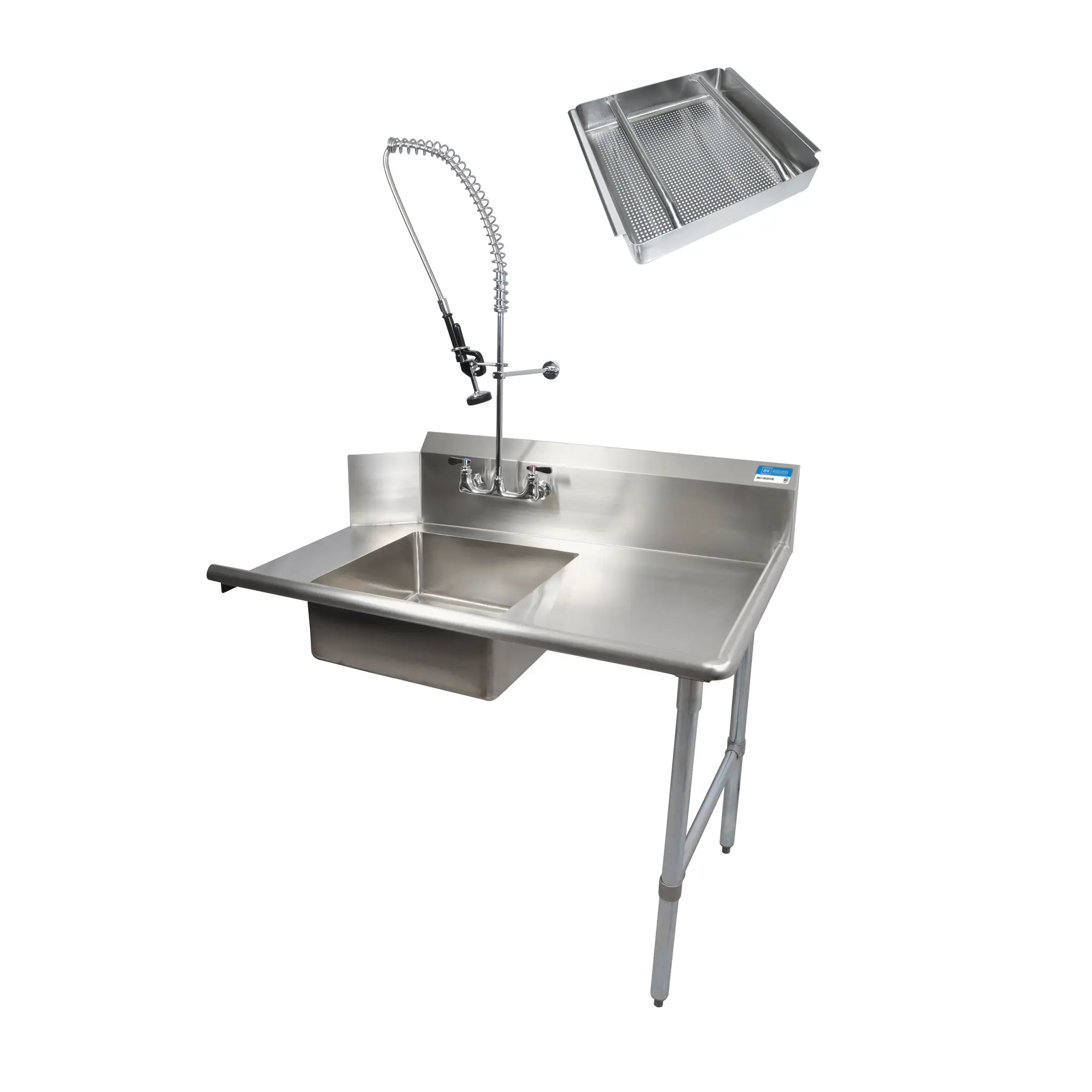 Enhance your commercial kitchen with the BK Resources BKSDT-26-R-P3-G Soiled Dishtable. This straight design dishtable is perfect for busy restaurant kitchens, offering a convenient and efficient solution for handling soiled dishes. Made with high-quality 18/304 stainless steel, this dishtable is built to withstand the demands of a commercial kitchen. It features a spacious 26"W x 30-3/8"D x 46-1/4"H size, providing ample space for dishwashing tasks. The right-to-left operation ensures smooth workflow and easy access to the pre-rinse sink. Speaking of which, the dishtable includes a 20" x 20" x 8" deep pre-rinse sink with an 8" OC splash mount pre-rinse faucet for thorough cleaning. The 10"H backsplash and raised rolled edges on the front and sides help contain splashes and prevent messes. With galvanized legs and side bracing, as well as high impact corrosion-resistant adjustable bullet feet, this dishtable is built to last. NSF certified, it meets the highest standards of sanitation and safety. Upgrade your kitchen with the BK Resources BKSDT-26-R-P3-G Soiled Dishtable and experience enhanced efficiency and cleanliness.