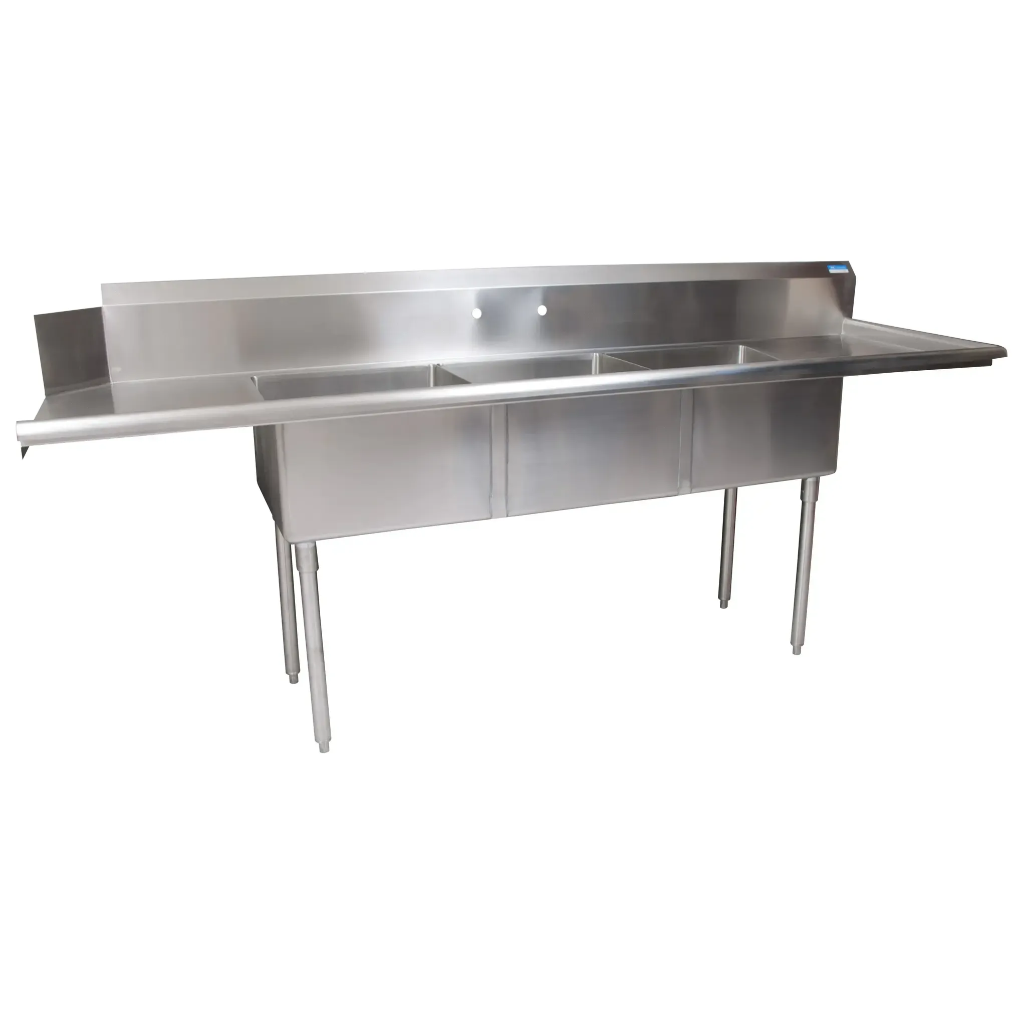 Cooking at its finest begins with the BK Resources BKSDT-3-20-12-20RS Dishtable with Potsinks. This commercial-grade dishtable and three-compartment sink is designed to meet the rigorous demands of a busy restaurant kitchen. With its spacious 100"W x 30-1/2"D x 44"H overall size, it provides ample workspace for food preparation and dishwashing tasks. The three 20" wide x 20" front-to-back x 12" deep compartments allow for efficient sorting and cleaning of dishes, while the 10"H backsplash and 8" OC splash mount faucet holes ensure a clean and sanitary environment. The dishtable includes three BKDR-4 basket drains, two BK-SDTS tray guides, and one BK-PRB-5 pre-rinse basket, making it a complete solution for your dishwashing needs. Made of durable 18/304 stainless steel with rolled edges and stainless steel legs and side bracing, this dishtable is built to withstand the demands of a commercial kitchen. With its NSF certification, you can trust the quality and reliability of this BK Resources dishtable. Upgrade your restaurant kitchen with the BKSDT-3-20-12-20RS Dishtable with Potsinks and experience the difference in efficiency and performance.