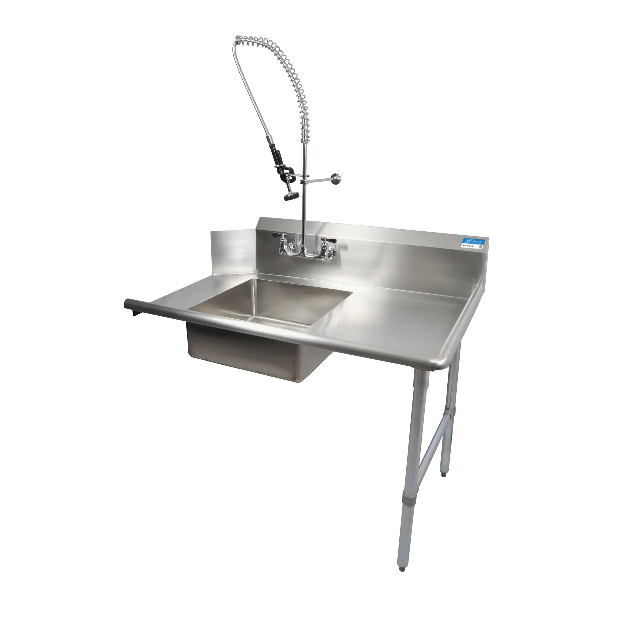 Take your kitchen to the next level with the BK Resources BKSDT-60-R-P-G Dishtable. This soiled dishtable is designed to enhance the efficiency and functionality of your commercial restaurant. With its straight design and dimensions of 60"W x 30-3/8"D x 46-1/4"H, it provides ample space for your dishwashing needs. The 18/304 stainless steel top ensures durability and easy cleaning, while the 20" x 20" x 8" deep pre-rinse sink and 8" OC splash mount pre-rinse faucet (BKF-SMPR-WB-G) make pre-rinsing a breeze. The raised rolled edges on the front and sides prevent spills and splashes, while the 10"H backsplash adds an extra layer of protection. The dishtable also includes a basket drain (BKDR-4), galvanized legs and side bracing, and high impact corrosion resistant adjustable bullet feet. NSF certified, this dishtable is a must-have for any commercial restaurant looking to optimize their dishwashing process.