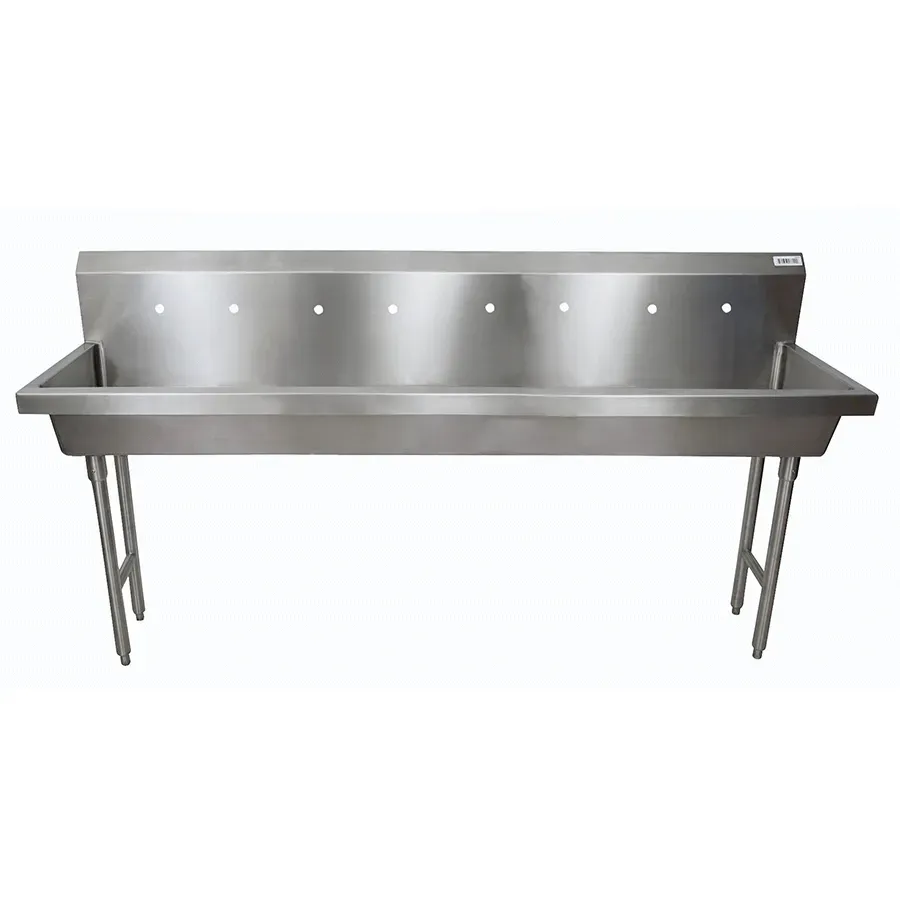 Boost your restaurant's performance with the BK Resources MSHS-96F2 Handwash Sink. This freestanding sink is designed to meet the demands of a busy commercial kitchen. With four sets of 8" OC splash mount faucet holes, it provides ample space for multiple staff members to wash their hands simultaneously, promoting hygiene and efficiency. The 96"W x 19-7/8" front-to-back x 8" deep bowl is made of 14/304 stainless steel, ensuring durability and resistance to corrosion. The sink also features a basket drain, making it easy to dispose of waste and maintain cleanliness. Supported by 18 gauge stainless steel legs and supports, this NSF-certified sink is built to withstand the rigors of a commercial restaurant environment. Upgrade your kitchen with the BK Resources MSHS-96F2 Handwash Sink and experience enhanced productivity and hygiene.