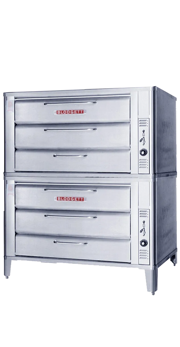 The Blodgett Deck Oven line has set industry wide standards for excellence in baking characteristics, performance and reliability. Simplicity of design and quality construction throughout assure years of trouble-free operation. Blodgett provides the strongest warranty in the business with a standard five-year door warranty! Creating endless possibilities with the Basic Four! The Blodgett large 900 Series gas deck ovens come in four basic sections. Each section has the same 60″ x 40″ footprint and can be stacked in any combination. The possibilities are endless. Separate heat controls for each section permit baking and roasting at different temperatures, simultaneously, in one oven! Blodgett’s Basic Four design gives you the ultimate in versatility, efficiency, and economy. 981-DBL is a double stack oven with four 7” high baking compartments and includes 7" adjustable s/s legs, s/s draft diverter or direct vent, crown angle trim and double gas connector