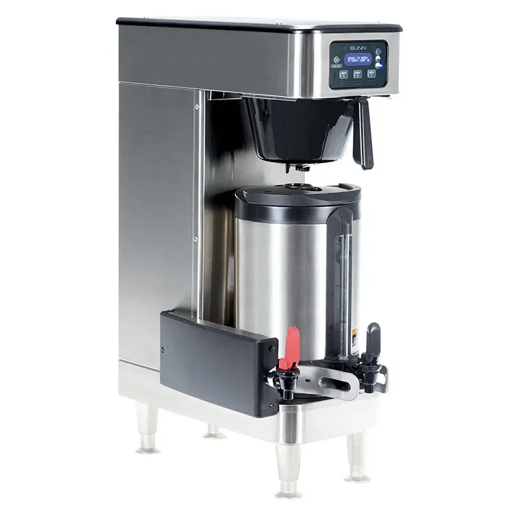 Upgrade your restaurant's coffee brewing capabilities with the Bunn 51100.0103 Coffee Brewer for Thermal Server. This high-quality coffee brewer is designed specifically for commercial restaurant use, making it the perfect addition to your establishment. With its pre-infusion and pulse brew features, you can ensure that every cup of coffee is brewed to perfection. The programmable digital display and wireless interface allow for easy operation and customization, while the USB programming capability and brew counter provide added convenience. The black plastic funnel and stainless steel & grey finish give this coffee brewer a sleek and professional look, while the 4" satin nickel legs provide stability. Whether you're serving breakfast, lunch, or dinner, this Bunn coffee brewer is a must-have for any commercial restaurant. Upgrade your coffee game today and impress your customers with the Bunn 51100.0103 Coffee Brewer for Thermal Server.