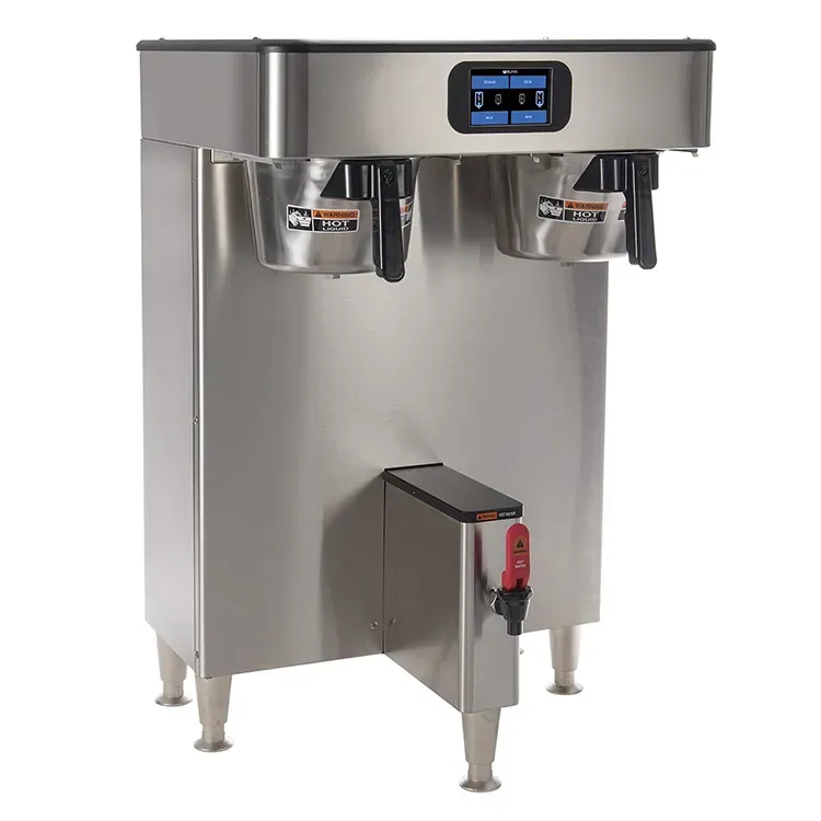 Transform your commercial restaurant into a hub of efficiency with the Bunn 54200.0101 Coffee Brewer for Thermal Server. This automatic twin brewer is designed to cater to high-volume demands, with a 5.6-gallon tank capacity and the ability to brew into 1-1/2 gallon servers. The infusion series features six brew buttons and two batch sizes, allowing for versatile brewing options. The smartWAVE sprayhead technology ensures optimal extraction and flavor, while the 4.3" touchscreen and programmable digital display make operation a breeze. With a USB port and wireless interface, you can easily update settings and access brewing data. The energy-saver mode helps reduce power consumption, and the electronic funnel lock ensures safety during operation. Finished in stainless steel with satin nickel legs, this coffee brewer combines durability and style. Elevate your restaurant's coffee service with the Bunn 54200.0101 Coffee Brewer for Thermal Server.