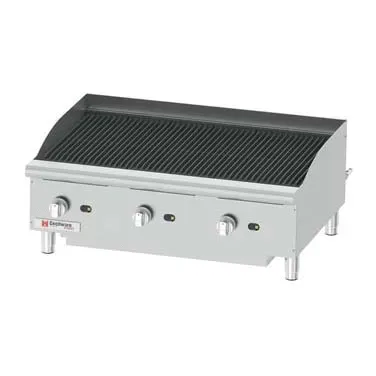 Experience the difference with innovative solutions when you choose the Grindmaster-cecilware CCP36 Gas Countertop Charbroiler. Designed specifically for commercial restaurant use, this charbroiler offers a spacious 36"W x 20"D cooking surface, allowing you to cook large quantities of food at once. With three powerful 40,000 BTU/hr burners, you can achieve the perfect sear and grill marks on your meats and vegetables. The reversible cast iron grilling grates ensure even heat distribution and excellent heat retention, while the angled sidewalls and bottom plate help to reduce flare-ups and enhance cooking efficiency. The stainless steel construction not only provides durability but also makes cleaning a breeze. With independent cooking zones and manual controls, you have full control over the cooking process. Trust in the reliability and performance of the Grindmaster-cecilware CCP36 Gas Countertop Charbroiler to elevate your restaurant's grilling capabilities.