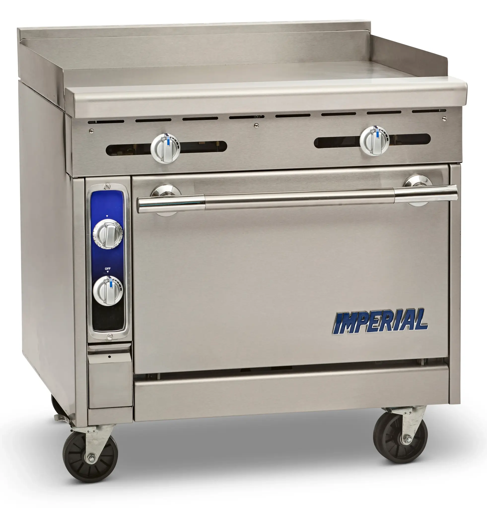 Enhance the heart of your restaurant with the Imperial, IHR-G36, Range, 36" Heavy Duty, Gas. This Diamond Series Heavy Duty Range is designed to meet the demands of a busy commercial kitchen. With a 36" griddle and a standard oven, this range offers versatility and efficiency in one unit. The manual controls allow for precise temperature adjustments, ensuring consistent cooking results every time. The 4"W grease gutter helps to keep the cooking surface clean and the stainless steel construction of the front, sides, landing ledge, backguard, and kick plate ensures durability and easy cleaning. The adjustable feet and 6" legs provide stability and flexibility in installation. With a powerful 130000 BTU, this range delivers the heat needed to cook a variety of dishes quickly and efficiently. Trust Imperial to provide reliable and high-quality equipment for your commercial kitchen.