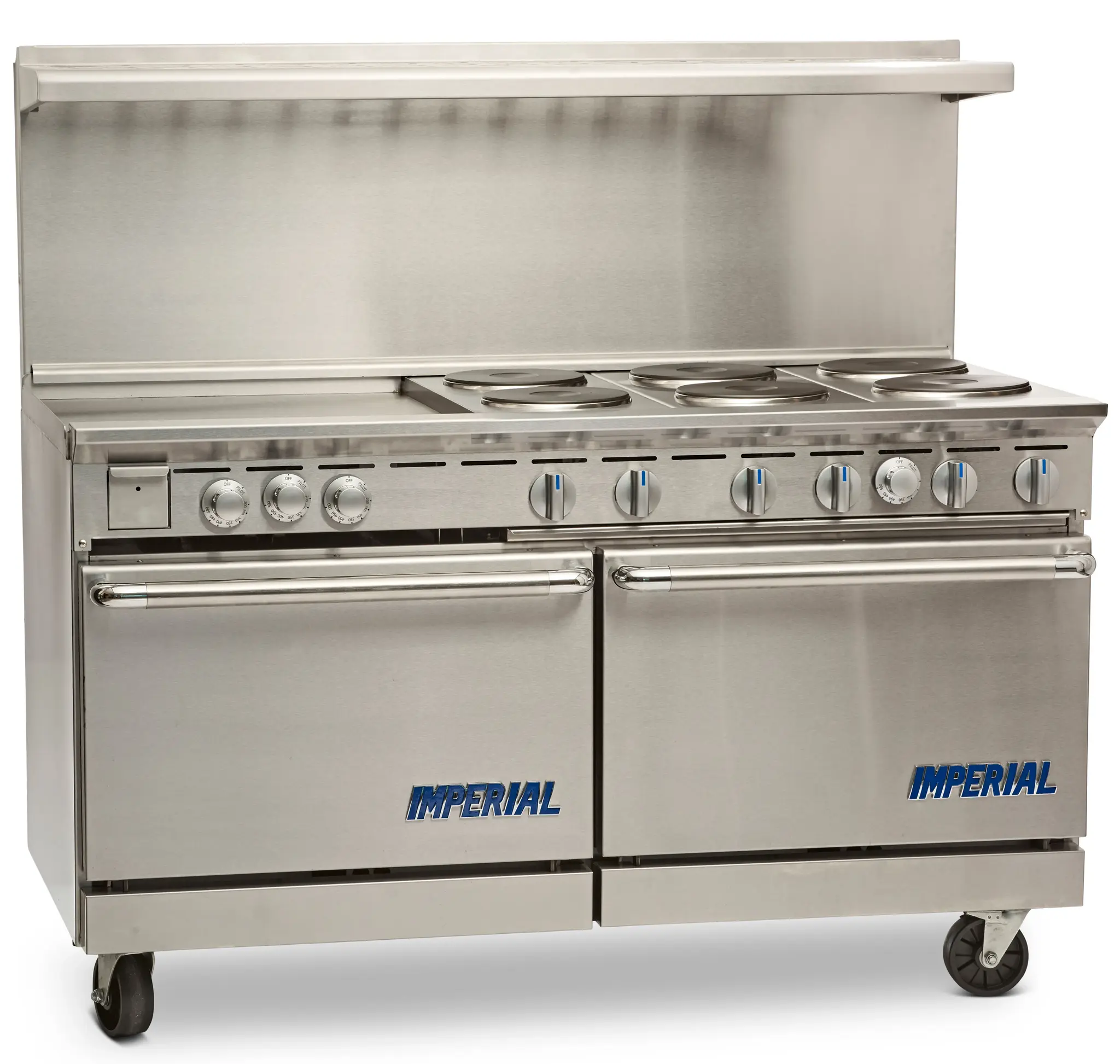 Invest in superior quality with the Imperial, IR-6-G24T-E, Range, 60" Restaurant, Electric. This restaurant range is designed to meet the demands of a busy commercial kitchen, offering exceptional performance and durability. With six round elements and a 24" thermostatic griddle, this range provides versatile cooking options to accommodate a variety of menu items. The two standard ovens feature a chrome rack per oven, allowing for efficient baking and roasting. The infinite heat controls ensure precise temperature adjustments, while the porcelain oven interior makes cleaning a breeze. The stainless steel front, sides, backguard, landing ledge, and kick plate not only enhance the range's durability but also give it a sleek and professional appearance. Equipped with 6" legs and adjustable feet, this range can be easily positioned and leveled to fit any kitchen layout. Trust the Imperial, IR-6-G24T-E, Range, 60" Restaurant, Electric to deliver exceptional performance and reliability in your commercial restaurant.